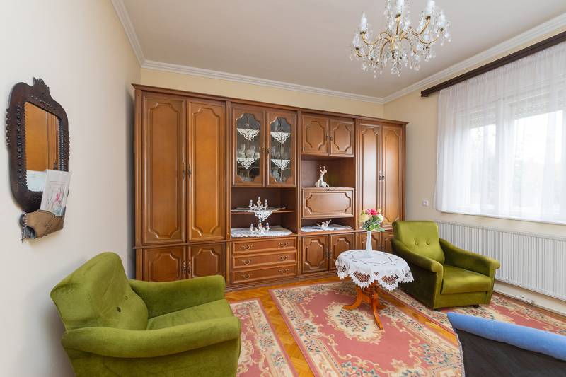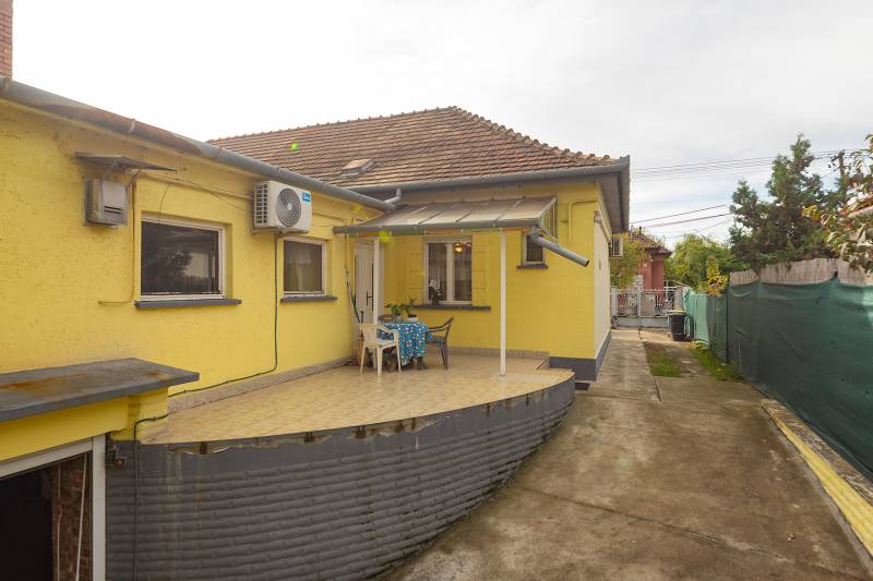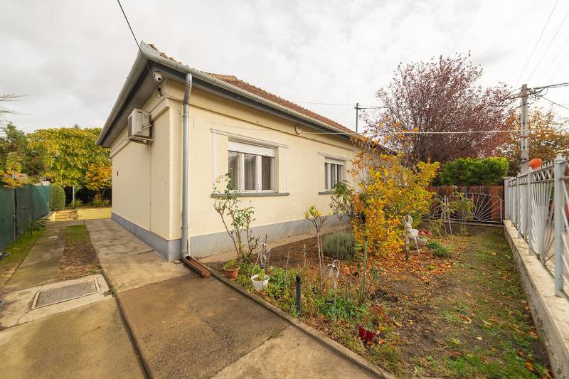 XVIII. kerületben a Béke tér környékén csendes mellékutcában, de kiváló közlekedéssel kínálunk megvásárlásra egy földszintes kialakítású ikerház felet. Klasszikus ikerház, a telek középen kerítéssel elválasztva, önálló utcai bejárat mindkét ikerfél lakói számára. A ház tégla építésű, cserép fedéses, belső elosztása tágas és kényelmes. A fedett teraszról nyílik a bejárat, egy jó méretű előszobából jutunk be a nagy méretű konyha-étkezőbe, innen két déli tájolású, világos szobát találunk, továbbá egy jó állapotú fürdőszoba, egy külön mellékhelyiség és egy belső lépcsőház is helyet kapott, innen közvetlenül juthatunk le a szuterén szinten lévő nagy garázsba. A házban kialakításra került még két szoba. A fűtést gázcirkó biztosítja, nyáron a kellemes hőmérsékletről két klíma gondoskodik. A telek 303 nm, a csatorna bekötése folyamatban van, február végére készen lesz. Telken belül több autóval is parkolhatunk, a garázsban további egy (kisebb) autó elfér, illetve van hely tárolásra is. A ház mögött egy kerti tároló is kialakításra került szerszámoknak, sporteszközöknek. Az utcai kapu elektromos. Csendes, családi házas mellékutca, a közelben (6 perc séta) több buszmegálló is megtalálható: 166, 236, 266, vonatállomás 5 perc séta, iskola, bevásárlási lehetőség, posta 5-10 percen belül gyalogosan elérhetők. Az ingatlan jogi háttere rendezett, rövid időn belül birtokba vehető.