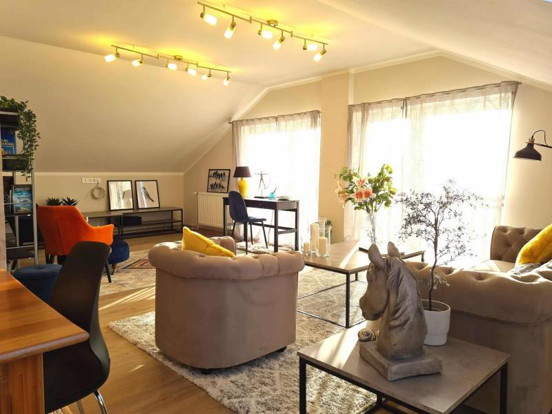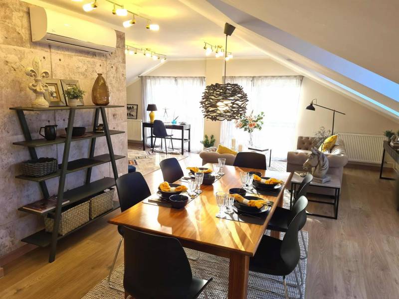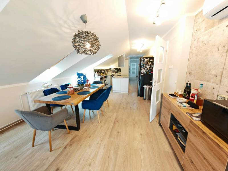 Ajkán, csendes és nyugodt környezetben eladó egy tágas, 103 nm-es tetőtéri lakás – tudatos, fiatal vásárlóknak kiváló választás.Az ingatlan egyedi megoldásokkal és minőségi kivitelezéssel készült, a mindennapi használhatóságot és a praktikus élettereket helyezve fókuszba.2020-ban egy időben, a lépcsőházban megtörtént a víz, villany, fűtés, csatornahálózat cseréje.Főbb jellemzők:- Alapterület: nettó 103 nm, bruttó 147 nm, tetőtéri kialakítás- Elrendezés: 3 hálószoba, 2 fürdőszoba, konyha-nappali, gardrób- Fűtés: távhő egyedi mérés nélkül, automata légtelenítőkkel- Hűtés: 4 db MIDEA klíma, melyek távolról is vezérelhetők- Két helyrajzi számon található az ingatlan (68 nm és 79 nm)- Külön helyrajzi számon, saját, 12 nm-es tároló tartozik a lakáshoz- Finanszírozás: CSOK-ra és egyéb egyedi kedvezményekre alkalmas- Tulajdoni viszonyok: rendezettek, teljesen tehermentesA lakás kiváló elosztású, világos: a három hálószoba és a két fürdőszoba a kényelmes együttélést támogatja, a konyha-nappali funkcionális központot ad a mindennapokhoz.A gardrób rendezett tárolási lehetőséget biztosít, a klíma a nyári komfortot növeli, a távhő pedig megbízható fűtést nyújt.A két külön helyrajzi számú kialakítás különválasztási lehetőséget teremt, ami a használat és a tervezés szempontjából rugalmas megoldás.Fiataloknak, első otthont keresőknek praktikus és méretében is versenyképes alternatíva, ahol a kész műszaki megoldások azonnal élhető tereket kínálnak.Kizárólag Otthon Centrum kínálatában érhető el.Hívjon mielőbb, és szakértői támogatással végig kísérem a biztonságos vásárlási folyamatot!Amennyiben felkeltette érdeklődésedet az ingatlan, kérlek, keress a megadott elérhetőségeken!Irodánk teljes körű HITEL-, BABAVÁRÓ és CSOK ügyintézéssel, biztosítással, energetikai tanúsítvány készítésével, valamint megbízható ügyvédi háttérrel segíti Ügyfeleit.#OtthonCentrum #lakás #ház #eladás #vétel #Veszprém #OC #Ingatlanadásvétel #eladva #Veszprémvármegye #Ingatlanközvetítő #Otthonszakértő #Albérlet #Ingatlaniroda #ingatlanos #szép #realestate #újlakás #újotthon #állás #álláskeresés #panel #panellakas #társasház #munka #instagood #családiház #szépházak #siker #homestaging #eladólakás #otthon #ingatlan #eladóingatlan #munkalehetőség #karrier