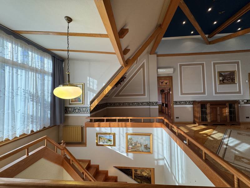 Fedezze fel álmai otthonát Diósdon – háromszintes, hét szobás, nagyvonalú családi ház eladóDiósd egyik legkedveltebb, csendes utcájában eladó egy 479 m²-es, háromszintes, exkluzív családi ház, amelyet térérzet, elegancia és átgondolt funkcionalitás jellemez. Az ingatlan egy 1111 m²-es, parkosított, szobrokkal díszített kertben helyezkedik el, ahol fűthető, római lépcsős medence és 12 m²-es télikert is szolgálja a pihenést.Földszint – a klasszikus elegancia szintjeA házba egy tágas előszobán és közlekedőn át jutunk, ahonnan megérkezünk a 36 m²-es nappaliba, amelyhez közvetlenül kapcsolódik a 12 m²-es télikertA 30 m²-es konyha–étkező–kamra egység családi és baráti összejövetelekhez ideális helyszín.Ezen a szinten található továbbá:37 m²-es hálószoba,12 m²-es gardrób,13 m²-es elegáns fürdőszoba,külön vendégmosdó,36,5 m²-es kétállásos garázs,valamint egy 13 m²-es terasz, amely a kert felé nyílik.Első emelet – a nagyvonalú terek birodalmaA felső szint 4,8 méteres belmagasságával és 73 m²-es nappali–társalgójával igazi különlegesség.Innen nyílnak a hálószobák, mind saját gardróbbal:25 m²-es hálószoba + 22 m²-es gardróbszoba,26 m²-es vendégszoba+ 21 m²-es gardróbszoba. Ezen a szinten található egy 14 m²-es, luxus kialakítású fürdőszoba valamint teraszkapcsolat is. A faburkolatú, üvegkorlátos lépcsőháza ház egyik legszebb, látványos eleme.Kertszint – külön élettér közvetlen kertkapcsolattalAz alsó szint egy önálló, teljes értékű élettér:konyha és étkezőnappali/vendégtér,fürdőszobakazánház és mosókonyhaközvetlen kijárat a gondozott kertbeFelszereltség és technológia- Vaillant gázkazán, padló- és radiátoros fűtés kombinációja-Szintenként szabályozható termosztátok-6 db Panasonic inverteres hűtő-fűtő klíma-Hóolvasztó rendszer a garázsbejárónál-A medencéhez külön fűtőkör-Automata, kútról üzemelő öntözőrendszerA kert – elegancia és nyugalomA parkosított, örökzöldekkel és díszcserjékkel beültetett kert a ház méltó folytatása.A fűthető, római lépcsős medence, a szobrok valamint a télikert együttese páratlan harmóniát teremt.Ez az ingatlan azok számára ideális választás, akik nem csupán házat, hanem életstílust keresnek – ahol a tér, az elegancia és a kifinomult részletek találkoznak.