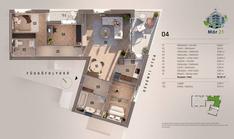 Fedezze fel ezt a lenyűgöző, új lakást, amely tökéletes választás lehet mind magánéleti, mind befektetési célokra. Az ingatlan alapterülete 86,9 négyzetméter, amely négy tágas szobát foglal magában, így ideális otthont biztosít családok számára, vagy akár több generáció együttélésére is.A lakásban két modern fürdőszoba található, amelyek kényelmet és praktikus megoldásokat kínálnak a mindennapok során. Az ingatlan állapota kiváló, a hőszivattyús fűtés és hűtés pedig biztosítja az optimális klímát az év bármely szakában. A 10,11 négyzetméteres erkélyről gyönyörű panorámás kilátás nyílik, amely lehetőséget ad a pihenésre és a szabadban való időtöltésre, emelettett egy Loggia is kialakításra kerül. Képzelje el, ahogy egy fárasztó nap után a teraszon ülve élvezi a naplementét, miközben a város zaja távol marad. A lakás biztonságos környéken található, ahol garantált a nyugodt életvitelt. A közlekedési lehetőségek kiválóak, hiszen a közeli busz- és villamosmegállók gyors és kényelmes eljutást biztosítanak a város többi pontjára. Az autós közlekedés is egyszerű, a közeli főutak gyors hozzáférést biztosítanak a városközponthoz és a környező településekhez. A környéken számos üzlet, iskola és egészségügyi intézmény található, így minden szükséges szolgáltatás könnyen elérhető. Ez az ingatlan nemcsak egy lakás, hanem egy lehetőség arra, hogy egy olyan környezetben éljen, ahol a mindennapok kényelmesen és biztonságosan telnek. Az ingatlan funkciója sokféle lehetőséget kínál, legyen szó családi otthonról vagy befektetési céllal történő vásárlásról. A modern építési technológiának köszönhetően a fenntartási költségek alacsonyak, ami hosszú távon is kedvező választássá teszi ezt a lakást. Bármilyen kérdése van az ingatlannal vagy a vásárlási folyamattal kapcsolatban, bátran keressen meg. Bizalommal állok rendelkezésére, hogy segítsek Önnek a legjobb döntés meghozatalában!Projekt bemutatásaA Mór utca és Dévényi utca sarkán, egy hangulatos saroktelken épül fel ez a 23 lakásos, modern megjelenésű, mégis a környezetébe harmonikusan illeszkedő társasház. A kivitelezés során kiemelt figyelmet kapott a benapozás, a jól élhető terek kialakítása, valamint a magas műszaki tartalom.Az épület földszint + 5 emelet kialakítású, pinceszinttel, ahol teremgarázs és tárolók is helyet kaptak. Minden szinten ergonomikusan megtervezett, kiváló elosztású lakások találhatók, jellemzően 42–90 m² közötti alapterülettel. A legtöbb lakáshoz saját loggia, erkély vagy terasz tartozik – a felső szinten exkluzív nagy teraszos lakások kerültek kialakításra.A társasház minden szempontból megfelel a mai kor elvárásainak:– 23 parkolóhely (12 a pinceszinten, 11 a földszinten), Elektromos autó töltési lehetőséggel– 6 tároló,– zöldtető és közösségi tetőkert,– geotermikus hőszivattyús fűtés és hűtés,– padlófűtés, fan-coil hűtés,– háromrétegű nyílászárók, korszerű hő- és hangszigetelés,– liftes megközelítés minden szinten.Az épület anyaghasználata prémium minőségű: terrakotta árnyalatú burkolólapok, világosszürke betonhatású elemek és szignálfehér falfelületek teszik igazán különlegessé a házat.A kiváló infrastruktúrájú környék – Jász utca, Lehel út, Róbert Károly körút, M3-as közelsége – garantálja a gyors közlekedést, míg a környező parkok, új fejlesztések és szolgáltatások emelik a lakók életminőségét.Ez a projekt ideális választás lehet városi otthont keresőknek, tudatos befektetőknek és azoknak, akik értékelik a magas minőséget és az élhető, modern lakókörnyezetet.