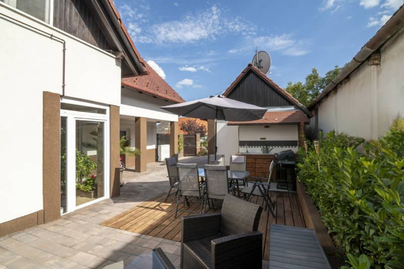 Eladó Törökbálinton egy két szintes családi ház csendes kertvárosi mégis központi részenTörökbálint a Budai agglomeráció egyik legkedveltebb települése, egy gyönyörű sváb település rengeteg helyi történettel, emlékművekkel, színházzal, rendezvényekkel, sportközponttal, uszodával, számos iskolával és óvodával.INGATLAN LEÍRÁSAA telken található egy két szintes nettó 147 nm-es családi ház, ami jelenleg két lakásra van osztva, (de könnyedén összenyitható) illetve egy külön álló nettó 21 nm-es kis ház.A három lakóegység összesen nettó 168 nm (bruttó 230 nm) lakóterületű, mind a három lakás az utcáról külön kapun keresztül közelíthető meg.A földszinti lakás:Nettó 57 nm lakóterületű lakás, 15 nm terasszal.Elrendezése: nagyméretű nappali, konyha sarokkal , 2 kis méretű szoba , zuhanyzós fürdőszoba wc-vel.Az emeleti lakás:Ehhez a lakáshoz tartozik egy udvari gépkocsi beálló, saját kert rész és terasz.A kertből egy kis téli kerten keresztül jutunk el az előszobába, a földszinti részen található még egy tároló.Az emelet elrendezése: nappali - konyha - étkező , 3 szoba, fürdőszoba zuhanyzóval és káddal + wc-vel , külön wc.Külön kis ház:Nettó 21 nm, nappali - konyha, zuhanyzós fürdőszoba wc-vel + galléria, kis terasszal.A ház 1996-ban nyerte el jelenlegi formáját, amikor egy teljes felújításon esett át, amelynek során kibővítették a földszinti részt és egy plusz emeletet építettek rá. Az épületben sok éven át étterem és különböző üzlethelyiségek működtek. 2018-ban teljes belső átalakítást végeztek, amelynek eredményeként három lakást alakítottak ki. Két éve a külső homlokzatot újra szigetelték és vakolták.TÖRÖKBÁLINTMa Törökbálint olyan város, amely egyrészről megtartotta falusias jellegét, másrészről pedig lakosságának kvalifikáltsága, az itt élő emberek \"Bálintszeretete\", a különböző közösségek alkotóereje, az itt működő vállalkozások sikere méltó helyet vívott ki magának Magyarországon, Budapest szomszédságában.A közelben minden megtalálható, ami a mindennapi élethez szükséges: boltok, gyógyszertár, óvoda, iskola, posta, cukrászda, buszmegálló 5 percen belül elérhető akár gyalogosan is.A közlekedés kiváló, autóval néhány perc alatt elérhető az M0, M1 és M7 autópálya, illetve tömegközlekedéssel is 20 perc alatt elérhető a Kelenföldi pályaudvar.Kiváló elhelyezkedése és zöldövezeti környezete miatt, meglátja és rögtön beleszeret.Amennyiben felkeltette érdeklődését a hirdetés, várom hívását.