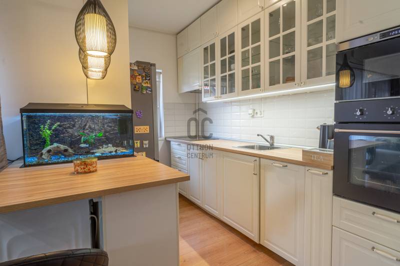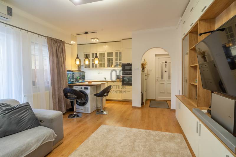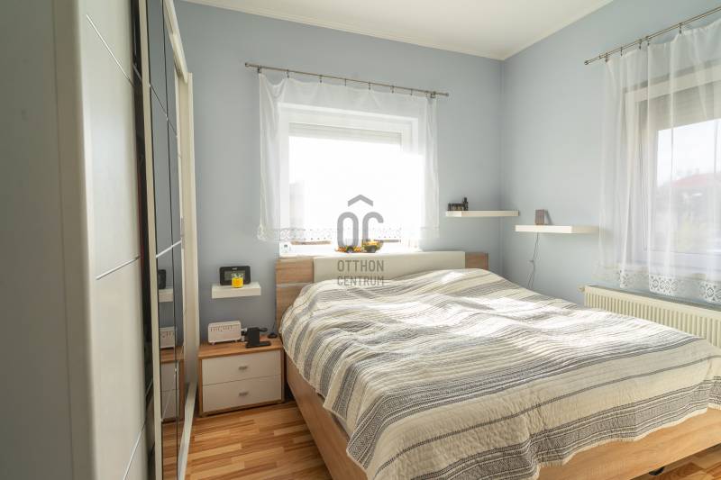 Dunakeszin a kedvelt Alagliget lakóparkban, rendezett, csendes környéken kínálunk megvásárlásra egy felújított, modern, nagy erkélyes lakást egy 2006-os építésű társasházban. Kis létszámú lakóház, összesen 8 lakás, az eladó lakás az első emeleten található. 48 nm+ 9 nm-es nagy erkély. Tágas, világos nappali-konyha-étkező, kényelmes méretű hálószoba, felújított szép kádas fürdőszoba, külön mellékhelyiség, praktikus előszoba pakolási lehetőséggel. A konyhában modern bútorzat lett beépítve mosogatógéppel, sütővel, mikróval, elektromos főzőlappal és szagelszívóval, melyek mind a vételár részét képezik. A nappaliban lévő modern beépített szekrény szintén a vételár része, itt egy klíma is felszerelésére került. A hálószobában egy nagy méretű franciaágy is elfér. Tartozik a lakáshoz egy kerti tároló és egy fedett autó beálló. A rezsi kifejezetten alacsony. Csendes, kulturált lakóközösség, szép, ápolt közös használatú kert sütögetővel. A környéken minden fontos közintézmény, bevásárlási lehetőség, iskola, buszmegálló rövid időn belül elérhető. A lakás gyorsan birtokba vehető.Ez az ingatlan a \"Felező csomag\" megbízási portfólióhoz tartozik. Részletek az Otthon Centrum weboldalán.