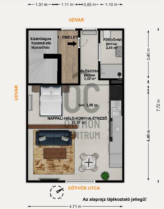 Különleges, karakteres lakás a XV. kerület szívében! Ez az 1. emeleti, 27 m²-es, teljesen felújított otthon egyedülálló hangulatot kínál saját, kijelölt előkerttel, két tárolóval és 1 nyitott gépkocsibeállóval.Az alaprajzon bemutatott berendezési javaslat segít elképzelni, hogyan lehetne a nappali–konyha–étkező–háló funkciókat egyetlen térben kényelmesen kialakítani, jelenleg a helyiségben csak a konyhabútor található.Főbb jellemzők:• 6 lakásos társasházban található• egyedi, ritka építészeti részletek jellemzik a házat, köztük a kézzel faragott fa tetődíszek• a lakás egy kizárólagos használatú zárt lépcsőházon keresztül közelíthető meg• bár az alapterület 27 m², a 3 méteres belmagasságnak köszönhetően a tér rendkívül tágas és levegős érzetet kelt• utcai nézetű nappali, DK tájolás révén rendkívül világosBelső tér és felújítás• Teljeskörűen felújított belső terek• Felújított közművek (víz, villany, gáz) - csupán a régi konvektorok nem lettek lecserélve• Modern, gépesített konyhabútor (sütő, tűzhely, fali páraelszívó, döntött üveges kialakítással, hűtőszekrény)• Új Ariston bojler• Tolóajtós fürdőszoba a helytakarékos kialakításért Extrák – ritka lehetőség:• 2 db saját tároló• 1 db udvari nyitott gépkocsibeálló• Kizárólagos használatú lépcsőház• 11,76 m² saját kijelölt előkert a lépcsőház bejárata előtt –bár még nincs kialakítva, de ideális hely egy hangulatos pihenőhelyhez vagy mini kerthezA társasház lakóközösségét kifejezetten nyugodt, barátságos, régóta itt élő emberek alkotják.Környék:• Kiváló infrastruktúra• Gyors belvárosi elérés• Központi elhelyezkedés, jó közlekedés, iskolák, óvodák, boltok, szolgáltatásokHa bármilyen kérdése felmerül, kérem, keressen bizalommal. Amennyiben szeretné személyesen is megtekinteni az ingatlant, hívjon fel és örömmel megmutatom.