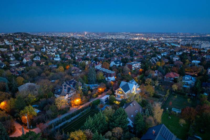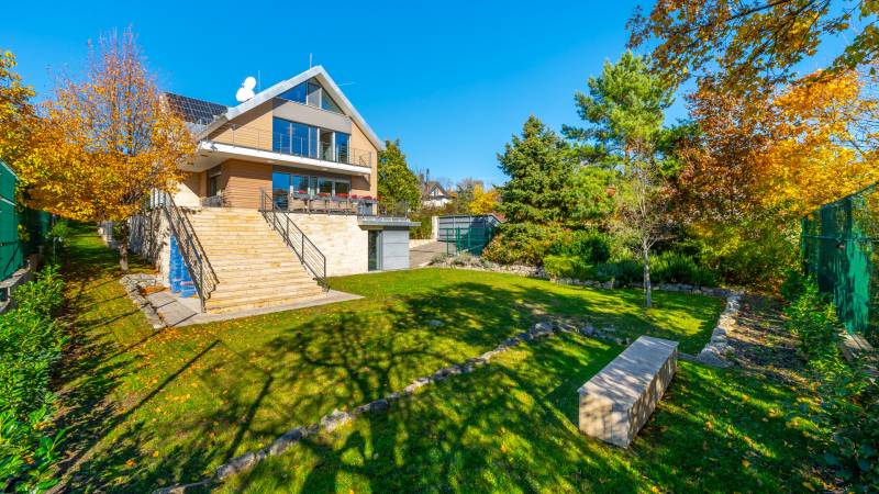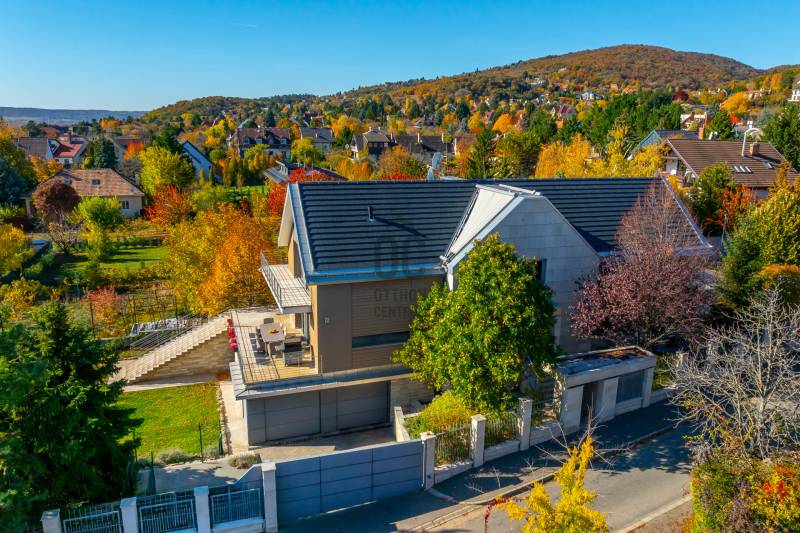Technológiailag előremutató, anyaghasználatában időtálló, élményében családbarát villa.Üdv itthon!RÖVID ÖSSZEFOGLALÓA XII. kerület erdőszegélyén, dombtetőn áll ez a 775 m²-es, négyszintes, déli tájolású családi villa egy ~2200 m²-es telken.11 szoba, 5 fürdő, 3 külön mosdó, tágas közösségi zónák, privát wellness és fitneszterem; a kertben saját teniszpálya és kosárlabdapálya, reflektorvilágítással.Technológia: geotermikus hűtés–fűtés (szondás hőszivattyú), padló- és falfűtés, falhűtés, hővisszanyerős szellőztető rendszer, napelemek és napkollektorok, továbbá okosotthon-rendszer, beépített multiroom hangrendszer, kamerarendszer és riasztó a legmagasabb fokú biztonság érdekében, valamint lift a kényelmes, energiatudatos mindennapokhoz.ELHELYEZKEDÉS ÉS KÖRNYEZETA ház Sasad fölötti, zöld, panorámás övben található: csend, tiszta levegő és erdőközeli miliő, mégis gyors városi elérés.Autóval a Széll Kálmán tér mindössze 7–8 perc, a MOM Park 10–15 perc alatt elérhető.Kelenföld és az M1/M7 autópálya-felhajtó rövid, logikus útvonalon közelíthető meg, így a Balaton is alig egy óra alatt elérhető.A mindennapi infrastruktúrát a Hegyvidék Központ, a környék delikátjai és kispiacai adják; hétvégén a Normafa–Tündérhegy vonal kínál sétát, sportot, kilátást.Családoknak kiemelkedő az iskolai kínálat: British International School, Osztrák Iskola, több magánóvoda és sportegyesület ésszerű távolságon belül.AZ ÉPÜLET, - A MESTERMŰA villa megújulása Bényei István, Ybl- és Pro Architectura-díjas építész nevéhez fűződik, akinek munkásságát a kortárs letisztultság, a precíz arányérzék és a természetes anyagok iránti tisztelet jellemzi.A Lidérc utcai ház az ő építészeti gondolkodásának esszenciája: a fény, a kő és a tér párbeszéde – egy otthon, amely egyszerre kortárs és időtálló.A 2014-ben befejezett felújítás során a cél az volt, hogy a korábbi struktúrát megnyitott, áramló terekkel, nagy üvegfelületekkel és a táj látványát beengedő homlokzati arányokkal alakítsák újjá.Az eredmény egy építészeti mű, amelyben a Jura mészkő, a bolgár zöld–fekete kvarcit, valamint a lépcsőrészen alkalmazott brazil arany kvarcit a meleg diófa felületekkel együtt olyan karaktert és időtálló eleganciát adnak a háznak, amely ritkán található meg a budapesti kínálatban.A finom részleteket Solinfo olasz designlámpák emelik ki, a beépített bútorokat pedig a Ligno Art készítette egyedi megrendelésre.A nyílászárók 7 kamrás, háromrétegű reflexiós üvegezésű rendszerek, amelyek kiemelkedő hő- és hangszigetelést biztosítanak.A borozó ajtaja és bútorzata Ázsiából származó, több mint százéves hajófa anyagból készült, eredeti viaszolt felülettel megőrizve.Az étkező ikonikus darabja a lávakőből készült asztal, amely acél állványon nyugszik, tömege meghaladja a fél tonnát.A házhoz két garázs és több felszíni beálló is tartozik, így a parkolás elegánsan, kényelmesen megoldott.AZ OTTHON BELSŐ VILÁGAMeleg elegancia és természetes harmónia: travertin, dió, puha textúrák és nagyvonalú arányok.A nappali padlótól mennyezetig futó üvegezése a panorámát a tér díszévé emeli; a mély ülésű kanapék köre beszélgetésre és elcsendesedésre egyaránt hív.A terasz a belső tér természetes folytatása: vasárnapi ebédek, esti borozások, aranyló lombkoronák.A konyha–étkező a ház szíve: letisztult frontok, tömör dió sziget, rejtett tárolók és prémium gépek.Itt keveredik a reggeli kávé illata a gyerekek nevetésével; minden részlet a családi ritmust szolgálja.A felső szinteken világos gyerekszobák és tágas hálók sorakoznak.Nem csupán kilátás, hanem élmény: térben, fényben, biztonságban lehet felnőni; a színek nyugalma és az arányok természetes tanulási–játék–pihenő közeget teremtenek.A szülői lakrész külön univerzum: kétoldali gardrób, privát terasz és szobaméretű, panorámás fürdő, ahol kő, fény és víz időtlen egységet alkot.A wellness-szint a feltöltődés tere: mozaikos, virágmotívumos medence üvegtetővel, szauna, jacuzzi, pihenőtér és Technogym-gépekkel felszerelt fitnesz.A nagy üvegfelületeknek köszönhetően az alsó szint is fényben gazdag; itt található a borospince, a családi játéktér, és az üvegfelületek mögött egy kis japán kert, amely tovább fokozza a nyugalom és harmónia érzetét.A KERT ÉS A SAJÁT SPORTPÁLYÁKA minőségi idő és az egészséges életmód itt a mindennapok természetes része.A tágas, parkosított kertben két különleges érték kapott helyet: egy teljes méretű teniszpálya és egy saját kosárlabdapálya, reflektorvilágítással.Ilyen lehetőség ma már szinte egyedülálló Budapesten – az új szabályozások miatt újonnan ilyen pályák építése gyakorlatilag nem engedélyezett.Ez a villa ezért nemcsak a kényelmet, hanem az aktív életmód szabadságát is biztosítja – mindezt a saját kert intimitásán belül.Összegzés és kapcsolatfelvételEz a ház azokat szólítja meg, akik a természet közelségét, a kényelmet és a valódi otthonélményt keresik — rang, tér és nyugalom kiegyensúlyozott egységében.Olyan otthon, ahol a gyerekek szabadságban nőnek fel, a felnőttek pedig békében élhetnek – ahol minden nap emlékké válik.Ha szeretné megtapasztalni, milyen, amikor a panoráma, a fény és a természet harmóniája adja az otthon valódi értelmét,kérem, vegye fel velem a kapcsolatot, és beszéljük meg a következő lépést.
