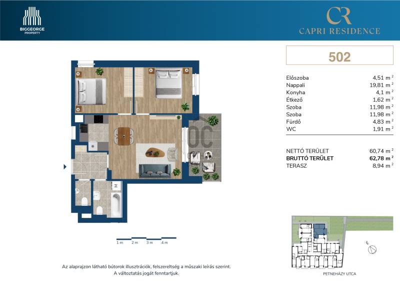 Projekt bemutatásaA Capri Residence a XIII. kerület szívében, a dinamikusan fejlődő Váci út közvetlen közelében valósul meg, amely Budapest egyik legkeresettebb lakáspiaci területe. Az elegáns, modern megjelenésű épületet, a homlokzatán végigfutó üvegkorlátos teraszok díszítik majd, a felsőbb szinteken pedig nagyteraszos lakások is elérhetők, amelyek egy része panorámás kilátást biztosít.Az épületben összesen 112 lakás kap helyet, amelyek elrendezése a stúdiótól a nappali plusz három hálószobásig terjednek. Az épületben emellett egy közösségi tér, 122 parkolóhely, 62 tároló, valamint opcionálisan elektromos autótöltővel szerelt teremgarázs beállók is megépítésre kerülnek.A műszaki felszereltség a legmagasabb szakmai trendeket követi: a Capri Residence lakóinak kényelmét mennyezeti hűtés-fűtés, háromrétegű üvegezéssel ellátott műanyag nyílászárók, smart-home előkészítés, valamint belsőépítész által összeállított belső anyagválaszték biztosítja majd. A földszinti lakásokhoz privát kertkapcsolat tartozik, emellett a társasház közös díszkerttel is rendelkezik.