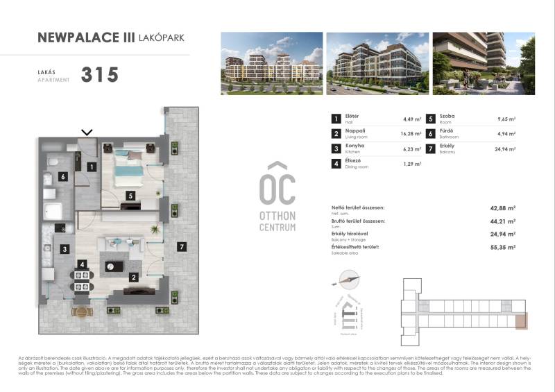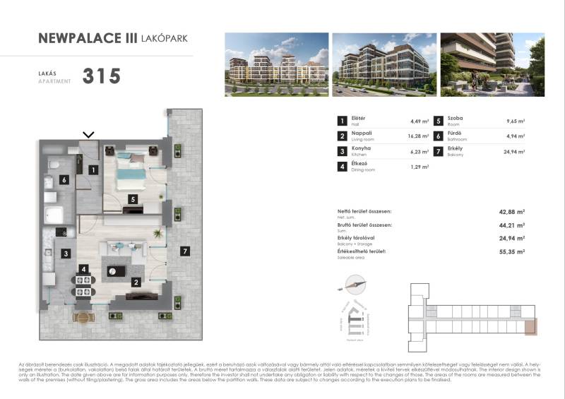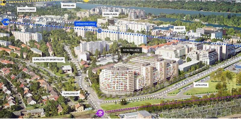 New Palace III. ütemA lakópark a XIII. kerület kertvárosias részén épül, a Duna Pláza vonzáskörzetében, 10 perc sétára a 3-as Metró Gyöngyösi utcai megállójától.A földszint + 13 emelet magas épületet elegáns, kertépítők által tervezet parkok veszik körül. A zárt, csak a társasház lakói által megközelíthető udvaron fákkal, cserjékkel tarkított, füvesített zöldkert kerül kialakításra.A lakáskínálat az egy szobás garzonlakásoktól a nappali + négy hálószobás lakásokig terjed, amelyek fűtés és melegvíz ellátása a jövő elvárásait is figyelembe véve környezetbarát, hőszivattyús mennyezeti hűtő, -fűtő rendszerrel megoldott.Vevőink bőséges kollekcióból választhatnak meleg- és hideg burkolatokat, illetve a beltéri látszó igényeket.A jelen adatok tájékoztató jellegűek, ezért a Beruházó (sem a hirdető) azok változásával, vagy bármely attól való eltéréssel kapcsolatban semmilyen kötelezettséget, vagy felelősséget nem vállal.Az alaprajzokon ábrázolt berendezési tárgyak és bútorok, a burkolatok megjelenése nem képezi a szerződés tárgyát. A pontos felszereltségről a műszaki leírásban olvashat bővebben.Tervezett átadás: 2026.Q4. További információval kapcsolatosan keressen bizalommal!