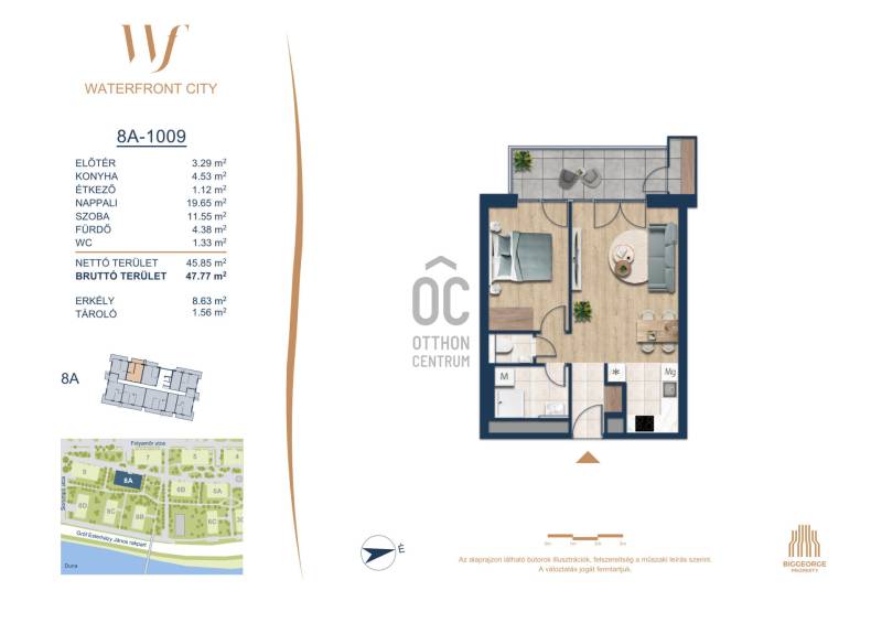 Projekt bemutatásaA projektrőlA Waterfront City egy új, modern városnegyed a 3. kerületben, ahol a természet közelsége és a városi kényelem tökéletes egyensúlyban van. A Duna-part közvetlen szomszédságában elhelyezkedő fejlesztés különleges atmoszférát kínál: a sétányt új épületek határolják, üzletekkel, kávézókkal és szolgáltatásokkal, amelyek élhető közösségi teret teremtenek.A 13 emeletes lakóépületből lenyűgöző örökpanoráma nyílik a budai hegyekre és a folyóra, a tágas teraszok pedig ideálisak a pihenéshez vagy a baráti összejövetelekhez. A zöldtetők, parkosított terek és fenntartható megoldások – mint az energiatakarékos rendszerek és okos otthon funkciók – mind hozzájárulnak a modern, környezettudatos életstílushoz.Látogass el értékesítési irodánkba, és tekintsd meg a városnegyed makettjét személyesen! Ismerd meg, milyen lesz az élet Budapest egyik legizgalmasabb új fejlesztésében!Óbuda szívébenKépzeld el, ahogy egy napsütéses délelőttön Óbuda szívében sétálsz, a Duna közelsége frissítően hat rád, miközben a Folyamőr utca, a Miklós tér és a Bogdáni út által határolt, öt hektáros területre érsz. A levegőben ott van a város történelme, mégis minden részletében a jövő hívogat.A 50 000 négyzetméteres területen egy hangulatos sétány vezet végig, amely egyenesen az óbudai Fő térre visz – mindössze 600 méterre. Ez a sétány nem csupán összeköt, hanem élményt nyújt: a Kolosy térről induló Óbudai Promenád részeként a város egyik legélhetőbb, legpezsgőbb szakaszán haladsz végig. És ha biciklivel érkeznél? A nemzetközi kerékpárút is itt halad el, Szentendre felé vezetve.Az 5. ütemben épülő 149 lakás mindegyike egyedi hangulatot kínál. Ahogy belépsz egy-egy otthonba, a hatalmas üvegfelületeken át beáradó fény és a tágas, szellős terek azonnal magukkal ragadnak. A kilátás? A Kaszap István park zöldje nyújt békét, míg a felsőbb emeletekről a Budai-hegység örökpanorámája tárul eléd – minden nap egy új festmény az ablakodban.A 6. ütemben 316 modern lakás épül, tágas teraszokkal és lenyűgöző kilátással a Dunára és a budai hegyekre. A lakók kényelmét őrszolgálat, kamerarendszer, mélygarázs, vendéglátóhelyek, belső park, játszótér és E-autó töltők szolgálják. Ez a projekt utolsó üteme, amely még közvetlen Duna-parti kapcsolattal rendelkezik.