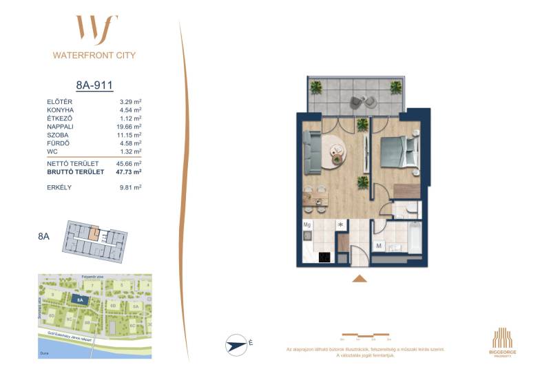 Projekt bemutatásaA projektrőlA Waterfront City egy új, modern városnegyed a 3. kerületben, ahol a természet közelsége és a városi kényelem tökéletes egyensúlyban van. A Duna-part közvetlen szomszédságában elhelyezkedő fejlesztés különleges atmoszférát kínál: a sétányt új épületek határolják, üzletekkel, kávézókkal és szolgáltatásokkal, amelyek élhető közösségi teret teremtenek.A 13 emeletes lakóépületből lenyűgöző örökpanoráma nyílik a budai hegyekre és a folyóra, a tágas teraszok pedig ideálisak a pihenéshez vagy a baráti összejövetelekhez. A zöldtetők, parkosított terek és fenntartható megoldások – mint az energiatakarékos rendszerek és okos otthon funkciók – mind hozzájárulnak a modern, környezettudatos életstílushoz.Látogass el értékesítési irodánkba, és tekintsd meg a városnegyed makettjét személyesen! Ismerd meg, milyen lesz az élet Budapest egyik legizgalmasabb új fejlesztésében!Óbuda szívébenKépzeld el, ahogy egy napsütéses délelőttön Óbuda szívében sétálsz, a Duna közelsége frissítően hat rád, miközben a Folyamőr utca, a Miklós tér és a Bogdáni út által határolt, öt hektáros területre érsz. A levegőben ott van a város történelme, mégis minden részletében a jövő hívogat.A 50 000 négyzetméteres területen egy hangulatos sétány vezet végig, amely egyenesen az óbudai Fő térre visz – mindössze 600 méterre. Ez a sétány nem csupán összeköt, hanem élményt nyújt: a Kolosy térről induló Óbudai Promenád részeként a város egyik legélhetőbb, legpezsgőbb szakaszán haladsz végig. És ha biciklivel érkeznél? A nemzetközi kerékpárút is itt halad el, Szentendre felé vezetve.Az 5. ütemben épülő 149 lakás mindegyike egyedi hangulatot kínál. Ahogy belépsz egy-egy otthonba, a hatalmas üvegfelületeken át beáradó fény és a tágas, szellős terek azonnal magukkal ragadnak. A kilátás? A Kaszap István park zöldje nyújt békét, míg a felsőbb emeletekről a Budai-hegység örökpanorámája tárul eléd – minden nap egy új festmény az ablakodban.A 6. ütemben 316 modern lakás épül, tágas teraszokkal és lenyűgöző kilátással a Dunára és a budai hegyekre. A lakók kényelmét őrszolgálat, kamerarendszer, mélygarázs, vendéglátóhelyek, belső park, játszótér és E-autó töltők szolgálják. Ez a projekt utolsó üteme, amely még közvetlen Duna-parti kapcsolattal rendelkezik.