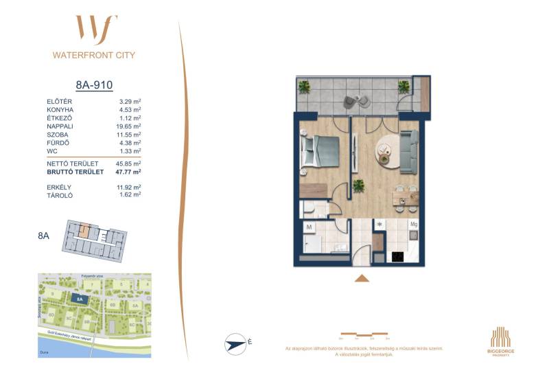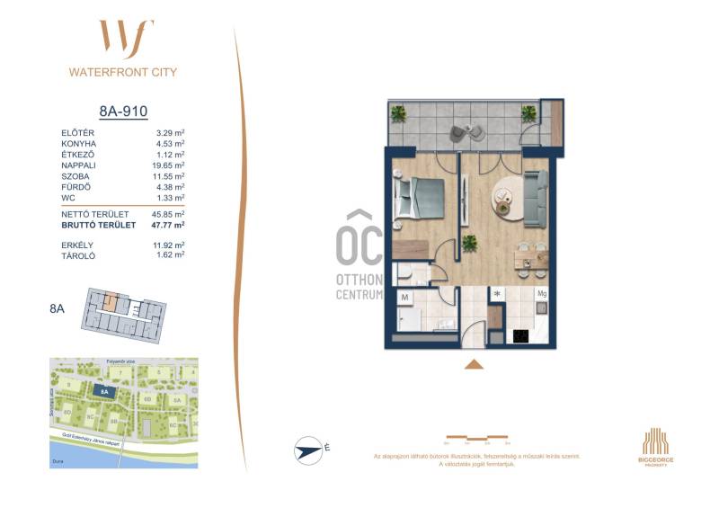 Projekt bemutatásaA projektrőlA Waterfront City egy új, modern városnegyed a 3. kerületben, ahol a természet közelsége és a városi kényelem tökéletes egyensúlyban van. A Duna-part közvetlen szomszédságában elhelyezkedő fejlesztés különleges atmoszférát kínál: a sétányt új épületek határolják, üzletekkel, kávézókkal és szolgáltatásokkal, amelyek élhető közösségi teret teremtenek.A 13 emeletes lakóépületből lenyűgöző örökpanoráma nyílik a budai hegyekre és a folyóra, a tágas teraszok pedig ideálisak a pihenéshez vagy a baráti összejövetelekhez. A zöldtetők, parkosított terek és fenntartható megoldások – mint az energiatakarékos rendszerek és okos otthon funkciók – mind hozzájárulnak a modern, környezettudatos életstílushoz.Látogass el értékesítési irodánkba, és tekintsd meg a városnegyed makettjét személyesen! Ismerd meg, milyen lesz az élet Budapest egyik legizgalmasabb új fejlesztésében!Óbuda szívébenKépzeld el, ahogy egy napsütéses délelőttön Óbuda szívében sétálsz, a Duna közelsége frissítően hat rád, miközben a Folyamőr utca, a Miklós tér és a Bogdáni út által határolt, öt hektáros területre érsz. A levegőben ott van a város történelme, mégis minden részletében a jövő hívogat.A 50 000 négyzetméteres területen egy hangulatos sétány vezet végig, amely egyenesen az óbudai Fő térre visz – mindössze 600 méterre. Ez a sétány nem csupán összeköt, hanem élményt nyújt: a Kolosy térről induló Óbudai Promenád részeként a város egyik legélhetőbb, legpezsgőbb szakaszán haladsz végig. És ha biciklivel érkeznél? A nemzetközi kerékpárút is itt halad el, Szentendre felé vezetve.Az 5. ütemben épülő 149 lakás mindegyike egyedi hangulatot kínál. Ahogy belépsz egy-egy otthonba, a hatalmas üvegfelületeken át beáradó fény és a tágas, szellős terek azonnal magukkal ragadnak. A kilátás? A Kaszap István park zöldje nyújt békét, míg a felsőbb emeletekről a Budai-hegység örökpanorámája tárul eléd – minden nap egy új festmény az ablakodban.A 6. ütemben 316 modern lakás épül, tágas teraszokkal és lenyűgöző kilátással a Dunára és a budai hegyekre. A lakók kényelmét őrszolgálat, kamerarendszer, mélygarázs, vendéglátóhelyek, belső park, játszótér és E-autó töltők szolgálják. Ez a projekt utolsó üteme, amely még közvetlen Duna-parti kapcsolattal rendelkezik.