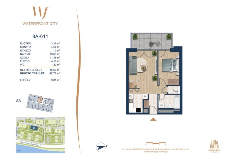 Projekt bemutatásaA projektrőlA Waterfront City egy új, modern városnegyed a 3. kerületben, ahol a természet közelsége és a városi kényelem tökéletes egyensúlyban van. A Duna-part közvetlen szomszédságában elhelyezkedő fejlesztés különleges atmoszférát kínál: a sétányt új épületek határolják, üzletekkel, kávézókkal és szolgáltatásokkal, amelyek élhető közösségi teret teremtenek.A 13 emeletes lakóépületből lenyűgöző örökpanoráma nyílik a budai hegyekre és a folyóra, a tágas teraszok pedig ideálisak a pihenéshez vagy a baráti összejövetelekhez. A zöldtetők, parkosított terek és fenntartható megoldások – mint az energiatakarékos rendszerek és okos otthon funkciók – mind hozzájárulnak a modern, környezettudatos életstílushoz.Látogass el értékesítési irodánkba, és tekintsd meg a városnegyed makettjét személyesen! Ismerd meg, milyen lesz az élet Budapest egyik legizgalmasabb új fejlesztésében!Óbuda szívébenKépzeld el, ahogy egy napsütéses délelőttön Óbuda szívében sétálsz, a Duna közelsége frissítően hat rád, miközben a Folyamőr utca, a Miklós tér és a Bogdáni út által határolt, öt hektáros területre érsz. A levegőben ott van a város történelme, mégis minden részletében a jövő hívogat.A 50 000 négyzetméteres területen egy hangulatos sétány vezet végig, amely egyenesen az óbudai Fő térre visz – mindössze 600 méterre. Ez a sétány nem csupán összeköt, hanem élményt nyújt: a Kolosy térről induló Óbudai Promenád részeként a város egyik legélhetőbb, legpezsgőbb szakaszán haladsz végig. És ha biciklivel érkeznél? A nemzetközi kerékpárút is itt halad el, Szentendre felé vezetve.Az 5. ütemben épülő 149 lakás mindegyike egyedi hangulatot kínál. Ahogy belépsz egy-egy otthonba, a hatalmas üvegfelületeken át beáradó fény és a tágas, szellős terek azonnal magukkal ragadnak. A kilátás? A Kaszap István park zöldje nyújt békét, míg a felsőbb emeletekről a Budai-hegység örökpanorámája tárul eléd – minden nap egy új festmény az ablakodban.A 6. ütemben 316 modern lakás épül, tágas teraszokkal és lenyűgöző kilátással a Dunára és a budai hegyekre. A lakók kényelmét őrszolgálat, kamerarendszer, mélygarázs, vendéglátóhelyek, belső park, játszótér és E-autó töltők szolgálják. Ez a projekt utolsó üteme, amely még közvetlen Duna-parti kapcsolattal rendelkezik.