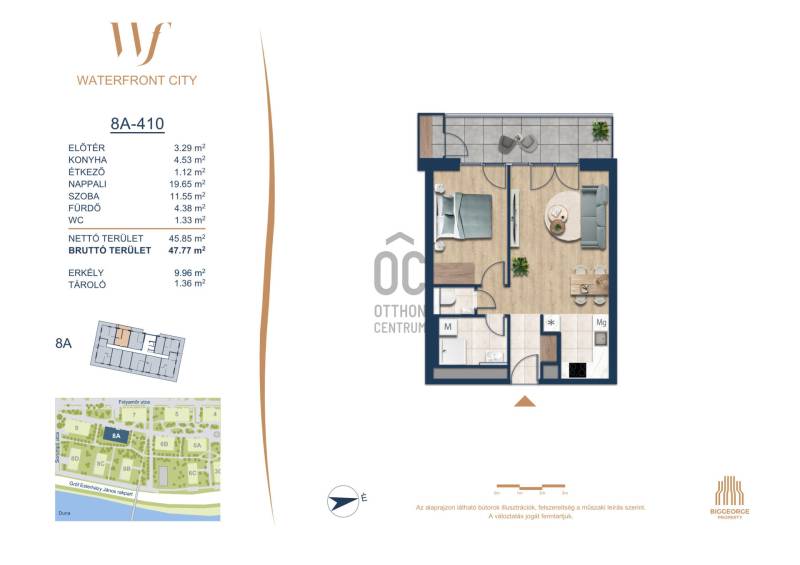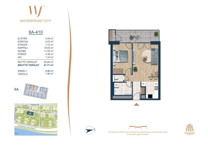Projekt bemutatásaA projektrőlA Waterfront City egy új, modern városnegyed a 3. kerületben, ahol a természet közelsége és a városi kényelem tökéletes egyensúlyban van. A Duna-part közvetlen szomszédságában elhelyezkedő fejlesztés különleges atmoszférát kínál: a sétányt új épületek határolják, üzletekkel, kávézókkal és szolgáltatásokkal, amelyek élhető közösségi teret teremtenek.A 13 emeletes lakóépületből lenyűgöző örökpanoráma nyílik a budai hegyekre és a folyóra, a tágas teraszok pedig ideálisak a pihenéshez vagy a baráti összejövetelekhez. A zöldtetők, parkosított terek és fenntartható megoldások – mint az energiatakarékos rendszerek és okos otthon funkciók – mind hozzájárulnak a modern, környezettudatos életstílushoz.Látogass el értékesítési irodánkba, és tekintsd meg a városnegyed makettjét személyesen! Ismerd meg, milyen lesz az élet Budapest egyik legizgalmasabb új fejlesztésében!Óbuda szívébenKépzeld el, ahogy egy napsütéses délelőttön Óbuda szívében sétálsz, a Duna közelsége frissítően hat rád, miközben a Folyamőr utca, a Miklós tér és a Bogdáni út által határolt, öt hektáros területre érsz. A levegőben ott van a város történelme, mégis minden részletében a jövő hívogat.A 50 000 négyzetméteres területen egy hangulatos sétány vezet végig, amely egyenesen az óbudai Fő térre visz – mindössze 600 méterre. Ez a sétány nem csupán összeköt, hanem élményt nyújt: a Kolosy térről induló Óbudai Promenád részeként a város egyik legélhetőbb, legpezsgőbb szakaszán haladsz végig. És ha biciklivel érkeznél? A nemzetközi kerékpárút is itt halad el, Szentendre felé vezetve.Az 5. ütemben épülő 149 lakás mindegyike egyedi hangulatot kínál. Ahogy belépsz egy-egy otthonba, a hatalmas üvegfelületeken át beáradó fény és a tágas, szellős terek azonnal magukkal ragadnak. A kilátás? A Kaszap István park zöldje nyújt békét, míg a felsőbb emeletekről a Budai-hegység örökpanorámája tárul eléd – minden nap egy új festmény az ablakodban.A 6. ütemben 316 modern lakás épül, tágas teraszokkal és lenyűgöző kilátással a Dunára és a budai hegyekre. A lakók kényelmét őrszolgálat, kamerarendszer, mélygarázs, vendéglátóhelyek, belső park, játszótér és E-autó töltők szolgálják. Ez a projekt utolsó üteme, amely még közvetlen Duna-parti kapcsolattal rendelkezik.