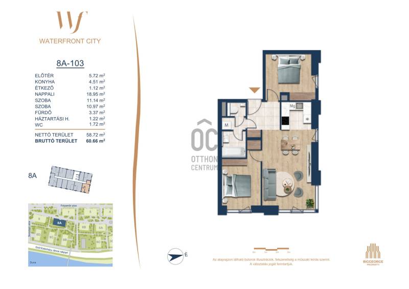 Projekt bemutatásaA projektrőlA Waterfront City egy új, modern városnegyed a 3. kerületben, ahol a természet közelsége és a városi kényelem tökéletes egyensúlyban van. A Duna-part közvetlen szomszédságában elhelyezkedő fejlesztés különleges atmoszférát kínál: a sétányt új épületek határolják, üzletekkel, kávézókkal és szolgáltatásokkal, amelyek élhető közösségi teret teremtenek.A 13 emeletes lakóépületből lenyűgöző örökpanoráma nyílik a budai hegyekre és a folyóra, a tágas teraszok pedig ideálisak a pihenéshez vagy a baráti összejövetelekhez. A zöldtetők, parkosított terek és fenntartható megoldások – mint az energiatakarékos rendszerek és okos otthon funkciók – mind hozzájárulnak a modern, környezettudatos életstílushoz.Látogass el értékesítési irodánkba, és tekintsd meg a városnegyed makettjét személyesen! Ismerd meg, milyen lesz az élet Budapest egyik legizgalmasabb új fejlesztésében!Óbuda szívébenKépzeld el, ahogy egy napsütéses délelőttön Óbuda szívében sétálsz, a Duna közelsége frissítően hat rád, miközben a Folyamőr utca, a Miklós tér és a Bogdáni út által határolt, öt hektáros területre érsz. A levegőben ott van a város történelme, mégis minden részletében a jövő hívogat.A 50 000 négyzetméteres területen egy hangulatos sétány vezet végig, amely egyenesen az óbudai Fő térre visz – mindössze 600 méterre. Ez a sétány nem csupán összeköt, hanem élményt nyújt: a Kolosy térről induló Óbudai Promenád részeként a város egyik legélhetőbb, legpezsgőbb szakaszán haladsz végig. És ha biciklivel érkeznél? A nemzetközi kerékpárút is itt halad el, Szentendre felé vezetve.Az 5. ütemben épülő 149 lakás mindegyike egyedi hangulatot kínál. Ahogy belépsz egy-egy otthonba, a hatalmas üvegfelületeken át beáradó fény és a tágas, szellős terek azonnal magukkal ragadnak. A kilátás? A Kaszap István park zöldje nyújt békét, míg a felsőbb emeletekről a Budai-hegység örökpanorámája tárul eléd – minden nap egy új festmény az ablakodban.A 6. ütemben 316 modern lakás épül, tágas teraszokkal és lenyűgöző kilátással a Dunára és a budai hegyekre. A lakók kényelmét őrszolgálat, kamerarendszer, mélygarázs, vendéglátóhelyek, belső park, játszótér és E-autó töltők szolgálják. Ez a projekt utolsó üteme, amely még közvetlen Duna-parti kapcsolattal rendelkezik.