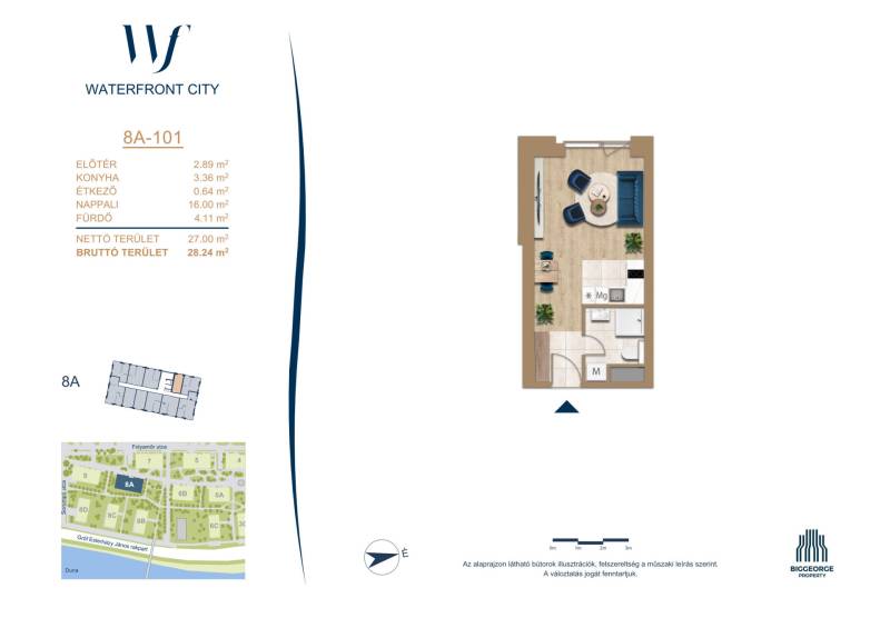 Projekt bemutatásaA projektrőlA Waterfront City egy új, modern városnegyed a 3. kerületben, ahol a természet közelsége és a városi kényelem tökéletes egyensúlyban van. A Duna-part közvetlen szomszédságában elhelyezkedő fejlesztés különleges atmoszférát kínál: a sétányt új épületek határolják, üzletekkel, kávézókkal és szolgáltatásokkal, amelyek élhető közösségi teret teremtenek.A 13 emeletes lakóépületből lenyűgöző örökpanoráma nyílik a budai hegyekre és a folyóra, a tágas teraszok pedig ideálisak a pihenéshez vagy a baráti összejövetelekhez. A zöldtetők, parkosított terek és fenntartható megoldások – mint az energiatakarékos rendszerek és okos otthon funkciók – mind hozzájárulnak a modern, környezettudatos életstílushoz.Látogass el értékesítési irodánkba, és tekintsd meg a városnegyed makettjét személyesen! Ismerd meg, milyen lesz az élet Budapest egyik legizgalmasabb új fejlesztésében!Óbuda szívébenKépzeld el, ahogy egy napsütéses délelőttön Óbuda szívében sétálsz, a Duna közelsége frissítően hat rád, miközben a Folyamőr utca, a Miklós tér és a Bogdáni út által határolt, öt hektáros területre érsz. A levegőben ott van a város történelme, mégis minden részletében a jövő hívogat.A 50 000 négyzetméteres területen egy hangulatos sétány vezet végig, amely egyenesen az óbudai Fő térre visz – mindössze 600 méterre. Ez a sétány nem csupán összeköt, hanem élményt nyújt: a Kolosy térről induló Óbudai Promenád részeként a város egyik legélhetőbb, legpezsgőbb szakaszán haladsz végig. És ha biciklivel érkeznél? A nemzetközi kerékpárút is itt halad el, Szentendre felé vezetve.Az 5. ütemben épülő 149 lakás mindegyike egyedi hangulatot kínál. Ahogy belépsz egy-egy otthonba, a hatalmas üvegfelületeken át beáradó fény és a tágas, szellős terek azonnal magukkal ragadnak. A kilátás? A Kaszap István park zöldje nyújt békét, míg a felsőbb emeletekről a Budai-hegység örökpanorámája tárul eléd – minden nap egy új festmény az ablakodban.A 6. ütemben 316 modern lakás épül, tágas teraszokkal és lenyűgöző kilátással a Dunára és a budai hegyekre. A lakók kényelmét őrszolgálat, kamerarendszer, mélygarázs, vendéglátóhelyek, belső park, játszótér és E-autó töltők szolgálják. Ez a projekt utolsó üteme, amely még közvetlen Duna-parti kapcsolattal rendelkezik.