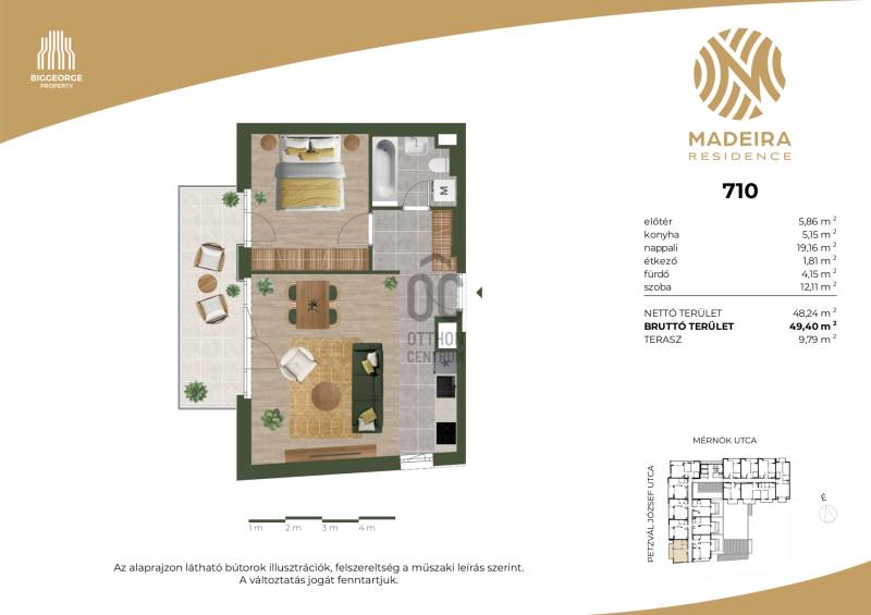 Projekt bemutatásaA projektrőlKépzeld el, ahogy belépsz Újbuda egyik legbékésebb, zöldövezeti utcájába, ahol a nyugalom átveszi a helyét a város zajos ritmusától. A Mérnök utcában, a Fehérvári út és az Etele út találkozásának közelében, egy elegánsan modern épület rajzolódik ki előtted – ez a Madeira Residence.Ahogy közelebb lépsz, a homlokzat letisztultsága, a loggiák ritmikus váltakozása azonnal megragadja a tekinteted. A pálcás korlátok finom eleganciát sugároznak, a napfény pedig játékosan tükröződik a teraszok üvegfelületein. Már kívülről is érezni: ez nem csupán egy lakóépület, hanem egy életérzés.Az első emeleti lakások egy része saját tetőkerttel rendelkezik – képzeld el, ahogy reggel a kávédat kortyolgatod a saját kis zöld oázisodban, miközben a madarak csicsergése tölti be a teret. Minden lakásban ott a tágas nappali, a kényelmes hálószobák, és a saját erkély vagy terasz, ahol a nap bármely szakában megpihenhetsz.A Madeira Residence nem csupán egy új építésű társasház – ez egy hely, ahol a modern életstílus találkozik a természet közelségével és a családbarát környezettel. Egy otthon, ahol minden nap élmény.A belső térben a kényelem és a fenntarthatóság kéz a kézben jár. A mennyezeti hűtés-fűtés rendszer csendesen gondoskodik a kellemes hőmérsékletről, az okosotthon-előkészítés pedig lehetővé teszi, hogy a technológia valóban a kényelmedet szolgálja. A mélygarázsban kényelmes parkolás vár, a kerékpártárolók és az elektromos autótöltési lehetőség pedig a környezettudatos életmódot támogatják.A környék infrastruktúrája kiváló: a közelben kiépített kerékpárutak, car sharing szolgáltatások és elektromos rollerek teszik egyszerűvé és fenntarthatóvá a közlekedést. A családosok számára külön öröm, hogy több játszótér is található a közelben – a gyerekek biztonságban, szabadon játszhatnak, miközben a szülők nyugodtan élvezhetik a környék nyugalmát.A Madeira Residence nem csupán egy új lakóépület – ez egy életérzés, ahol a mindennapok élménnyé válnak.