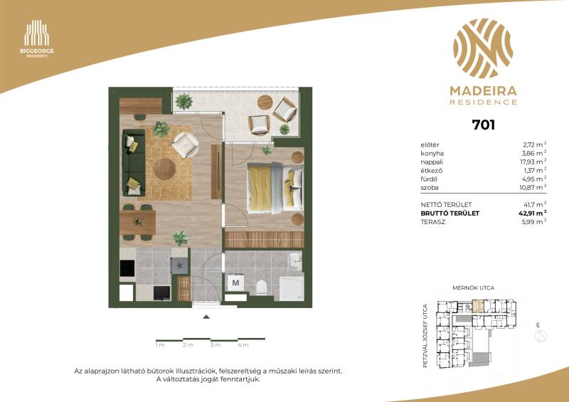 Projekt bemutatásaA projektrőlKépzeld el, ahogy belépsz Újbuda egyik legbékésebb, zöldövezeti utcájába, ahol a nyugalom átveszi a helyét a város zajos ritmusától. A Mérnök utcában, a Fehérvári út és az Etele út találkozásának közelében, egy elegánsan modern épület rajzolódik ki előtted – ez a Madeira Residence.Ahogy közelebb lépsz, a homlokzat letisztultsága, a loggiák ritmikus váltakozása azonnal megragadja a tekinteted. A pálcás korlátok finom eleganciát sugároznak, a napfény pedig játékosan tükröződik a teraszok üvegfelületein. Már kívülről is érezni: ez nem csupán egy lakóépület, hanem egy életérzés.Az első emeleti lakások egy része saját tetőkerttel rendelkezik – képzeld el, ahogy reggel a kávédat kortyolgatod a saját kis zöld oázisodban, miközben a madarak csicsergése tölti be a teret. Minden lakásban ott a tágas nappali, a kényelmes hálószobák, és a saját erkély vagy terasz, ahol a nap bármely szakában megpihenhetsz.A Madeira Residence nem csupán egy új építésű társasház – ez egy hely, ahol a modern életstílus találkozik a természet közelségével és a családbarát környezettel. Egy otthon, ahol minden nap élmény.A belső térben a kényelem és a fenntarthatóság kéz a kézben jár. A mennyezeti hűtés-fűtés rendszer csendesen gondoskodik a kellemes hőmérsékletről, az okosotthon-előkészítés pedig lehetővé teszi, hogy a technológia valóban a kényelmedet szolgálja. A mélygarázsban kényelmes parkolás vár, a kerékpártárolók és az elektromos autótöltési lehetőség pedig a környezettudatos életmódot támogatják.A környék infrastruktúrája kiváló: a közelben kiépített kerékpárutak, car sharing szolgáltatások és elektromos rollerek teszik egyszerűvé és fenntarthatóvá a közlekedést. A családosok számára külön öröm, hogy több játszótér is található a közelben – a gyerekek biztonságban, szabadon játszhatnak, miközben a szülők nyugodtan élvezhetik a környék nyugalmát.A Madeira Residence nem csupán egy új lakóépület – ez egy életérzés, ahol a mindennapok élménnyé válnak.