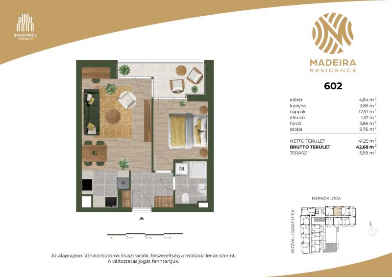Projekt bemutatásaA projektrőlKépzeld el, ahogy belépsz Újbuda egyik legbékésebb, zöldövezeti utcájába, ahol a nyugalom átveszi a helyét a város zajos ritmusától. A Mérnök utcában, a Fehérvári út és az Etele út találkozásának közelében, egy elegánsan modern épület rajzolódik ki előtted – ez a Madeira Residence.Ahogy közelebb lépsz, a homlokzat letisztultsága, a loggiák ritmikus váltakozása azonnal megragadja a tekinteted. A pálcás korlátok finom eleganciát sugároznak, a napfény pedig játékosan tükröződik a teraszok üvegfelületein. Már kívülről is érezni: ez nem csupán egy lakóépület, hanem egy életérzés.Az első emeleti lakások egy része saját tetőkerttel rendelkezik – képzeld el, ahogy reggel a kávédat kortyolgatod a saját kis zöld oázisodban, miközben a madarak csicsergése tölti be a teret. Minden lakásban ott a tágas nappali, a kényelmes hálószobák, és a saját erkély vagy terasz, ahol a nap bármely szakában megpihenhetsz.A Madeira Residence nem csupán egy új építésű társasház – ez egy hely, ahol a modern életstílus találkozik a természet közelségével és a családbarát környezettel. Egy otthon, ahol minden nap élmény.A belső térben a kényelem és a fenntarthatóság kéz a kézben jár. A mennyezeti hűtés-fűtés rendszer csendesen gondoskodik a kellemes hőmérsékletről, az okosotthon-előkészítés pedig lehetővé teszi, hogy a technológia valóban a kényelmedet szolgálja. A mélygarázsban kényelmes parkolás vár, a kerékpártárolók és az elektromos autótöltési lehetőség pedig a környezettudatos életmódot támogatják.A környék infrastruktúrája kiváló: a közelben kiépített kerékpárutak, car sharing szolgáltatások és elektromos rollerek teszik egyszerűvé és fenntarthatóvá a közlekedést. A családosok számára külön öröm, hogy több játszótér is található a közelben – a gyerekek biztonságban, szabadon játszhatnak, miközben a szülők nyugodtan élvezhetik a környék nyugalmát.A Madeira Residence nem csupán egy új lakóépület – ez egy életérzés, ahol a mindennapok élménnyé válnak.
