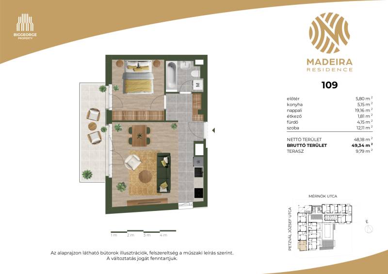 Projekt bemutatásaA projektrőlKépzeld el, ahogy belépsz Újbuda egyik legbékésebb, zöldövezeti utcájába, ahol a nyugalom átveszi a helyét a város zajos ritmusától. A Mérnök utcában, a Fehérvári út és az Etele út találkozásának közelében, egy elegánsan modern épület rajzolódik ki előtted – ez a Madeira Residence.Ahogy közelebb lépsz, a homlokzat letisztultsága, a loggiák ritmikus váltakozása azonnal megragadja a tekinteted. A pálcás korlátok finom eleganciát sugároznak, a napfény pedig játékosan tükröződik a teraszok üvegfelületein. Már kívülről is érezni: ez nem csupán egy lakóépület, hanem egy életérzés.Az első emeleti lakások egy része saját tetőkerttel rendelkezik – képzeld el, ahogy reggel a kávédat kortyolgatod a saját kis zöld oázisodban, miközben a madarak csicsergése tölti be a teret. Minden lakásban ott a tágas nappali, a kényelmes hálószobák, és a saját erkély vagy terasz, ahol a nap bármely szakában megpihenhetsz.A Madeira Residence nem csupán egy új építésű társasház – ez egy hely, ahol a modern életstílus találkozik a természet közelségével és a családbarát környezettel. Egy otthon, ahol minden nap élmény.A belső térben a kényelem és a fenntarthatóság kéz a kézben jár. A mennyezeti hűtés-fűtés rendszer csendesen gondoskodik a kellemes hőmérsékletről, az okosotthon-előkészítés pedig lehetővé teszi, hogy a technológia valóban a kényelmedet szolgálja. A mélygarázsban kényelmes parkolás vár, a kerékpártárolók és az elektromos autótöltési lehetőség pedig a környezettudatos életmódot támogatják.A környék infrastruktúrája kiváló: a közelben kiépített kerékpárutak, car sharing szolgáltatások és elektromos rollerek teszik egyszerűvé és fenntarthatóvá a közlekedést. A családosok számára külön öröm, hogy több játszótér is található a közelben – a gyerekek biztonságban, szabadon játszhatnak, miközben a szülők nyugodtan élvezhetik a környék nyugalmát.A Madeira Residence nem csupán egy új lakóépület – ez egy életérzés, ahol a mindennapok élménnyé válnak.