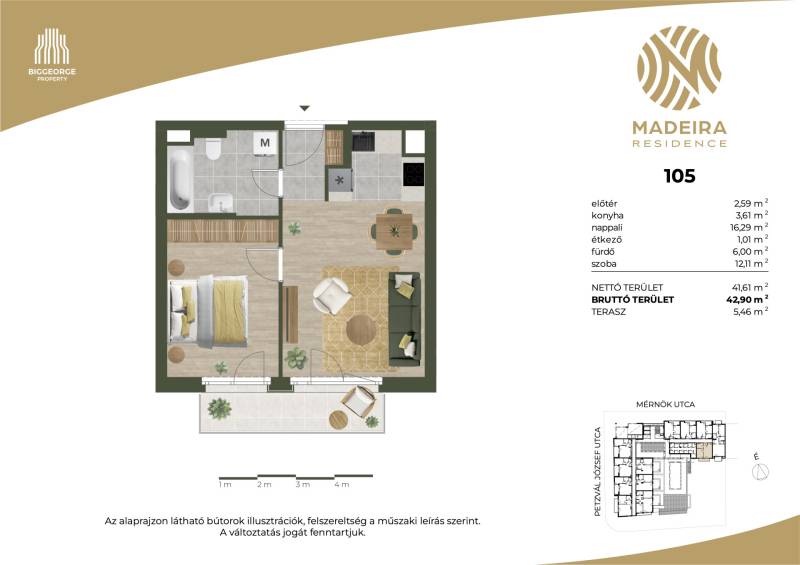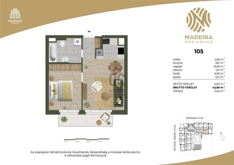 Projekt bemutatásaA projektrőlKépzeld el, ahogy belépsz Újbuda egyik legbékésebb, zöldövezeti utcájába, ahol a nyugalom átveszi a helyét a város zajos ritmusától. A Mérnök utcában, a Fehérvári út és az Etele út találkozásának közelében, egy elegánsan modern épület rajzolódik ki előtted – ez a Madeira Residence.Ahogy közelebb lépsz, a homlokzat letisztultsága, a loggiák ritmikus váltakozása azonnal megragadja a tekinteted. A pálcás korlátok finom eleganciát sugároznak, a napfény pedig játékosan tükröződik a teraszok üvegfelületein. Már kívülről is érezni: ez nem csupán egy lakóépület, hanem egy életérzés.Az első emeleti lakások egy része saját tetőkerttel rendelkezik – képzeld el, ahogy reggel a kávédat kortyolgatod a saját kis zöld oázisodban, miközben a madarak csicsergése tölti be a teret. Minden lakásban ott a tágas nappali, a kényelmes hálószobák, és a saját erkély vagy terasz, ahol a nap bármely szakában megpihenhetsz.A Madeira Residence nem csupán egy új építésű társasház – ez egy hely, ahol a modern életstílus találkozik a természet közelségével és a családbarát környezettel. Egy otthon, ahol minden nap élmény.A belső térben a kényelem és a fenntarthatóság kéz a kézben jár. A mennyezeti hűtés-fűtés rendszer csendesen gondoskodik a kellemes hőmérsékletről, az okosotthon-előkészítés pedig lehetővé teszi, hogy a technológia valóban a kényelmedet szolgálja. A mélygarázsban kényelmes parkolás vár, a kerékpártárolók és az elektromos autótöltési lehetőség pedig a környezettudatos életmódot támogatják.A környék infrastruktúrája kiváló: a közelben kiépített kerékpárutak, car sharing szolgáltatások és elektromos rollerek teszik egyszerűvé és fenntarthatóvá a közlekedést. A családosok számára külön öröm, hogy több játszótér is található a közelben – a gyerekek biztonságban, szabadon játszhatnak, miközben a szülők nyugodtan élvezhetik a környék nyugalmát.A Madeira Residence nem csupán egy új lakóépület – ez egy életérzés, ahol a mindennapok élménnyé válnak.