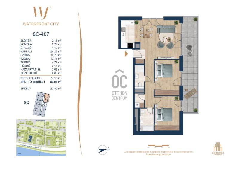 Projekt bemutatásaA projektrőlA Waterfront City egy új, modern városnegyed a 3. kerületben, ahol a természet közelsége és a városi kényelem tökéletes egyensúlyban van. A Duna-part közvetlen szomszédságában elhelyezkedő fejlesztés különleges atmoszférát kínál: a sétányt új épületek határolják, üzletekkel, kávézókkal és szolgáltatásokkal, amelyek élhető közösségi teret teremtenek.A 13 emeletes lakóépületből lenyűgöző örökpanoráma nyílik a budai hegyekre és a folyóra, a tágas teraszok pedig ideálisak a pihenéshez vagy a baráti összejövetelekhez. A zöldtetők, parkosított terek és fenntartható megoldások – mint az energiatakarékos rendszerek és okos otthon funkciók – mind hozzájárulnak a modern, környezettudatos életstílushoz.Látogass el értékesítési irodánkba, és tekintsd meg a városnegyed makettjét személyesen! Ismerd meg, milyen lesz az élet Budapest egyik legizgalmasabb új fejlesztésében!Óbuda szívébenKépzeld el, ahogy egy napsütéses délelőttön Óbuda szívében sétálsz, a Duna közelsége frissítően hat rád, miközben a Folyamőr utca, a Miklós tér és a Bogdáni út által határolt, öt hektáros területre érsz. A levegőben ott van a város történelme, mégis minden részletében a jövő hívogat.A 50 000 négyzetméteres területen egy hangulatos sétány vezet végig, amely egyenesen az óbudai Fő térre visz – mindössze 600 méterre. Ez a sétány nem csupán összeköt, hanem élményt nyújt: a Kolosy térről induló Óbudai Promenád részeként a város egyik legélhetőbb, legpezsgőbb szakaszán haladsz végig. És ha biciklivel érkeznél? A nemzetközi kerékpárút is itt halad el, Szentendre felé vezetve.Az 5. ütemben épülő 149 lakás mindegyike egyedi hangulatot kínál. Ahogy belépsz egy-egy otthonba, a hatalmas üvegfelületeken át beáradó fény és a tágas, szellős terek azonnal magukkal ragadnak. A kilátás? A Kaszap István park zöldje nyújt békét, míg a felsőbb emeletekről a Budai-hegység örökpanorámája tárul eléd – minden nap egy új festmény az ablakodban.A 6. ütemben 316 modern lakás épül, tágas teraszokkal és lenyűgöző kilátással a Dunára és a budai hegyekre. A lakók kényelmét őrszolgálat, kamerarendszer, mélygarázs, vendéglátóhelyek, belső park, játszótér és E-autó töltők szolgálják. Ez a projekt utolsó üteme, amely még közvetlen Duna-parti kapcsolattal rendelkezik.