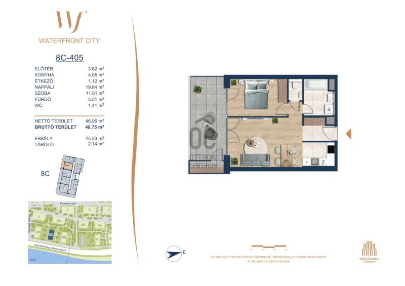 Projekt bemutatásaA projektrőlA Waterfront City egy új, modern városnegyed a 3. kerületben, ahol a természet közelsége és a városi kényelem tökéletes egyensúlyban van. A Duna-part közvetlen szomszédságában elhelyezkedő fejlesztés különleges atmoszférát kínál: a sétányt új épületek határolják, üzletekkel, kávézókkal és szolgáltatásokkal, amelyek élhető közösségi teret teremtenek.A 13 emeletes lakóépületből lenyűgöző örökpanoráma nyílik a budai hegyekre és a folyóra, a tágas teraszok pedig ideálisak a pihenéshez vagy a baráti összejövetelekhez. A zöldtetők, parkosított terek és fenntartható megoldások – mint az energiatakarékos rendszerek és okos otthon funkciók – mind hozzájárulnak a modern, környezettudatos életstílushoz.Látogass el értékesítési irodánkba, és tekintsd meg a városnegyed makettjét személyesen! Ismerd meg, milyen lesz az élet Budapest egyik legizgalmasabb új fejlesztésében!Óbuda szívébenKépzeld el, ahogy egy napsütéses délelőttön Óbuda szívében sétálsz, a Duna közelsége frissítően hat rád, miközben a Folyamőr utca, a Miklós tér és a Bogdáni út által határolt, öt hektáros területre érsz. A levegőben ott van a város történelme, mégis minden részletében a jövő hívogat.A 50 000 négyzetméteres területen egy hangulatos sétány vezet végig, amely egyenesen az óbudai Fő térre visz – mindössze 600 méterre. Ez a sétány nem csupán összeköt, hanem élményt nyújt: a Kolosy térről induló Óbudai Promenád részeként a város egyik legélhetőbb, legpezsgőbb szakaszán haladsz végig. És ha biciklivel érkeznél? A nemzetközi kerékpárút is itt halad el, Szentendre felé vezetve.Az 5. ütemben épülő 149 lakás mindegyike egyedi hangulatot kínál. Ahogy belépsz egy-egy otthonba, a hatalmas üvegfelületeken át beáradó fény és a tágas, szellős terek azonnal magukkal ragadnak. A kilátás? A Kaszap István park zöldje nyújt békét, míg a felsőbb emeletekről a Budai-hegység örökpanorámája tárul eléd – minden nap egy új festmény az ablakodban.A 6. ütemben 316 modern lakás épül, tágas teraszokkal és lenyűgöző kilátással a Dunára és a budai hegyekre. A lakók kényelmét őrszolgálat, kamerarendszer, mélygarázs, vendéglátóhelyek, belső park, játszótér és E-autó töltők szolgálják. Ez a projekt utolsó üteme, amely még közvetlen Duna-parti kapcsolattal rendelkezik.