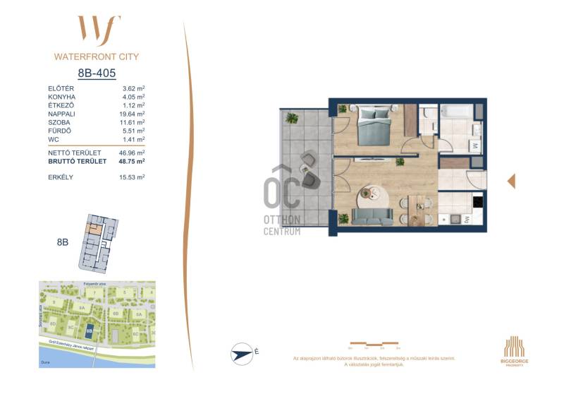 Projekt bemutatásaA projektrőlA Waterfront City egy új, modern városnegyed a 3. kerületben, ahol a természet közelsége és a városi kényelem tökéletes egyensúlyban van. A Duna-part közvetlen szomszédságában elhelyezkedő fejlesztés különleges atmoszférát kínál: a sétányt új épületek határolják, üzletekkel, kávézókkal és szolgáltatásokkal, amelyek élhető közösségi teret teremtenek.A 13 emeletes lakóépületből lenyűgöző örökpanoráma nyílik a budai hegyekre és a folyóra, a tágas teraszok pedig ideálisak a pihenéshez vagy a baráti összejövetelekhez. A zöldtetők, parkosított terek és fenntartható megoldások – mint az energiatakarékos rendszerek és okos otthon funkciók – mind hozzájárulnak a modern, környezettudatos életstílushoz.Látogass el értékesítési irodánkba, és tekintsd meg a városnegyed makettjét személyesen! Ismerd meg, milyen lesz az élet Budapest egyik legizgalmasabb új fejlesztésében!Óbuda szívébenKépzeld el, ahogy egy napsütéses délelőttön Óbuda szívében sétálsz, a Duna közelsége frissítően hat rád, miközben a Folyamőr utca, a Miklós tér és a Bogdáni út által határolt, öt hektáros területre érsz. A levegőben ott van a város történelme, mégis minden részletében a jövő hívogat.A 50 000 négyzetméteres területen egy hangulatos sétány vezet végig, amely egyenesen az óbudai Fő térre visz – mindössze 600 méterre. Ez a sétány nem csupán összeköt, hanem élményt nyújt: a Kolosy térről induló Óbudai Promenád részeként a város egyik legélhetőbb, legpezsgőbb szakaszán haladsz végig. És ha biciklivel érkeznél? A nemzetközi kerékpárút is itt halad el, Szentendre felé vezetve.Az 5. ütemben épülő 149 lakás mindegyike egyedi hangulatot kínál. Ahogy belépsz egy-egy otthonba, a hatalmas üvegfelületeken át beáradó fény és a tágas, szellős terek azonnal magukkal ragadnak. A kilátás? A Kaszap István park zöldje nyújt békét, míg a felsőbb emeletekről a Budai-hegység örökpanorámája tárul eléd – minden nap egy új festmény az ablakodban.A 6. ütemben 316 modern lakás épül, tágas teraszokkal és lenyűgöző kilátással a Dunára és a budai hegyekre. A lakók kényelmét őrszolgálat, kamerarendszer, mélygarázs, vendéglátóhelyek, belső park, játszótér és E-autó töltők szolgálják. Ez a projekt utolsó üteme, amely még közvetlen Duna-parti kapcsolattal rendelkezik.