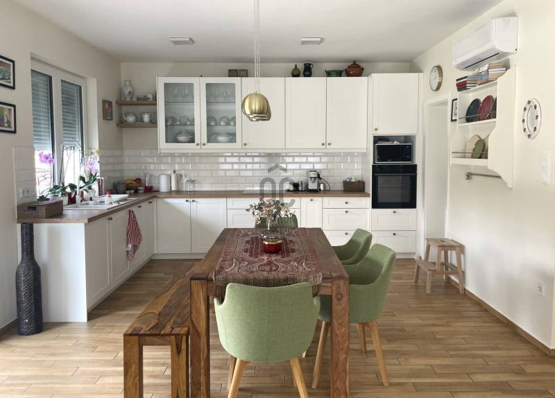 Eladó Üllőn, újszerű állapotban egy kitűnő beosztású, kiváló minőségben épült, földszintes, 112,3 (nettó) nm-es 5 szobás családi ház, mely lakóterületén túl 3,4 nm-es fedett belépővel és 18 nm-es terasszal is rendelkezik. A ház 2022-ben épült, 601 nm-es telekkel rendelkezik, ami egy kizárólagos használati megosztással rendezett telek belső fele. Tágas és teraszkapcsolatos nappali-konyha-étkezőn túl, 4 szobával, háztartási helyiséggel, két fürdővel, tágas előszobával és kamrával is rendelkezik. Fűtését gáz-cirkó biztosítja, a főfalak 15, a faszerkezetű födém 30 cm szigeteléssel rendelkezik, (redőnnyel, és kívűlről mészkő párkánnyal ellátott) műanyag nyílászárói három rétegűek. A világos, praktikus elrendezésű házból, a jó ízléssel válogatott és magas minőségben beépített burkolatok és szaniterek, valamint a koherensen kivitelezett beépített bútorok teremtenek otthont. Ezen felül az ingatlan élhetőségét, kényelmét biztosítja számtalan kiegészítő és műszaki megoldás, mint például az elektromos kapu, a parkosított kertben telepített fúrt kútról üzemeltetett öntözőrendszer, a vakondhálóval ellátott gyepszőnyeg, az udvari tároló kisház, a kialakított gépkocsibeálló, a szobákban elhelyezett 5 db, H-tarifás mérőről üzemeltetett klíma, a riasztórendszer teljes vezetékezésének előre kiépítése, az ízléses konyha gépesítése, a padlástérben kialakított kb. 4 nm-es pakolható terület. Elhelyezkedésének köszönhetően közlekedése kitűnő, vasútállomás sétatávolságra, gyorsforgalmi út pár perc alatt elérhető. A lakókörnyezet barátságos, a közelben óvoda, bölcsöde és játszótér is megtalálható. A birtokba adás tervezett ideje 2026 július közepe.Amennyiben felkeltettem érdeklődését, várom hívását!