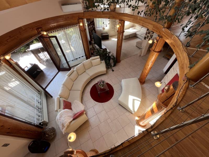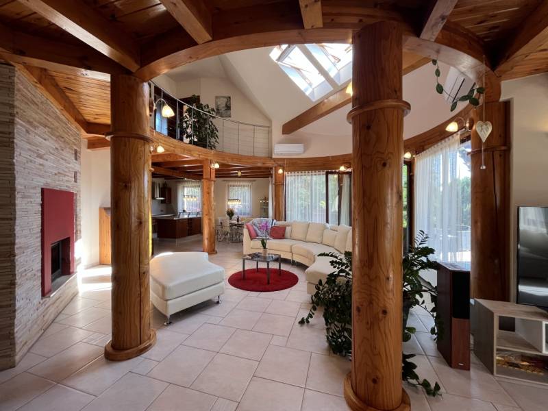 Exkluzív családi ház Veresegyház legszebb, zöldövezeti részén!Nyugodt, természetközeli környezetben kínálunk megvételre egy magas műszaki tartalommal, kifinomult ízléssel megépített prémium családi otthont, amely a tágas élettereket, az időtálló minőséget és a privát életstílust helyezi előtérbe.Reprezentatív terek & elegáns arányok:• 297 m² gondosan megtervezett lakótér• 6 méteres belmagasságú, különleges kivitelezésű, galériás nappali, kandallóval• nagyvonalú amerikai konyha kényelmes étkezővel• többfunkciós tetőtéri szint – hatalmas dolgozószoba, hálószobák, vendégtér vagy privát lakrész kialakításáraA belső terek tágas és harmonikus arányai, valamint a természetes fény jelenléte jellemzi az egész épületet.Prémium anyaghasználat & beépített megoldások:• porotherm téglából épült, szigetelt ház• különleges, fa oszlopos tartószerkezetek• számos egyedileg tervezett beépített bútor• diszkréten integrált tárolómegoldások• minőségi kivitelezés, időtálló részletekPrivát kert & kültéri luxus:• 800 m²-es, parkosított, intim kert• automata öntözőrendszer kiépítve• 60 m²-es DNy-i tájolású, fedett terasz, székely dézsával• két különálló faház - egy kisebb és egy nagyobb tároló• tökéletes helyszín pihenéshez, családi eseményekhez, vendéglátáshozKényelmes parkolás & praktikum:• garázs• fedett autóbeálló• bőséges tárolási lehetőségek a telken és az épületen belül isKorszerű technológia & fenntartható komfort:• padlófűtés kondenzációs kazánról, radiátorokkal kiegészítve• alternatív megoldások: kandalló, ionkazán• napelemek, napkollektor, klímaberendezések• víz kezelő rendszer, riasztó• energiahatékony, tudatosan kialakított gépészetKitűnő lokáció – természet és elérhetőség egyensúlya:• Csendes, zöldövezeti környezet• Budapest gyorsan és kényelmesen elérhető• Ideális külföldi vásárlók számára is, akik értékelik a repülőtér közelségét és a prémium életstílustEz az otthon azok számára készült, akik nem kompromisszumokban, hanem életminőségben gondolkodnak.
