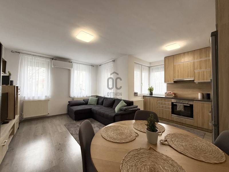 Eladó földszinti lakás Debrecenben, a Hatvan utcai kertben!Eladásra kínálunk egy kifogástalan állapotú, földszinti, 59m2-es lakást a Hatvan utcai kertben!Főbb jellemzői:- 2009-ben épült 12 lakásos társasház földszinti lakása- 59m2, elosztása kiváló: két hálószoba (9-10m2), amerikai konyhás nappali (25m2), fürdőszoba (4m2), toalett (2m2), közlekedő (9m2) helyiségekből áll- fűtése gázcirkó, radiátoros hőleadókkal- klimatizált- műanyag nyílászárók, redőnnyel, rovarhálóval ellátva- a bútorzat a vételár részét képezi, konyhája teljesen gépesített, 12 terítékes mosogatógéppel- NY-i tájolású, napfényes lakás- közös költség 15.475Ft, mely tartalmazza a kertrendezést és lépcsőház takarítását- a társasház közös, nagyméretű udvarral rendelkezik, szalonnasütővel, játszótérrel- parkolni a társasház előtt kényelmesen lehet- tehermentes- rövid időn belül birtokba vehetőTovábbi kérdés, megtekintés esetén várom hívását!