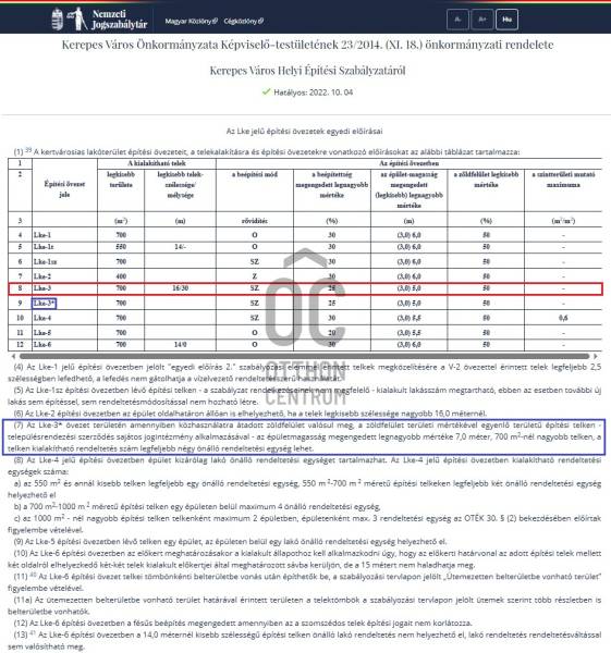HA ESETLEG CSAK EGY HOSSZABB TÁVÚ BEFEKTETÉSBEN GONDOLKODNA VAGY HA MÉG - EGYELŐRE - TUDNA VÁRNI EGY KICSIT AZ ÉPÍTKEZÉSSEL, DE ENNEK ELLENÉRE MÁR MOST EGY KIVÁLÓ HELYEN LÉVŐ ÉS KIVÁLÓ ADOTTSÁGOKKAL RENDELKEZŐ, BELTERÜLETI, LAKÓÖVEZETI, ÉPÍTÉSI (SAROK)TELKET KERES, AKKOR EZEN AJÁNLATOM ÖNNEK LETT CÍMEZVE……A pesti agglomerációban található Kerepes településnek a Szilasligeti oldalán, csendes / nyugodt zöldövezeti környezetben lévő és kellemes panorámával büszkélkedő Széphegy domb tetején kínálom eladásra ezt a belterület, lakóövezeti, a helyi építési szabályzat előírása szerint „Lke-3”-as besorolású, 637 m2-es alapterületű, közműhálózatokkal (villany, víz és csatorna) is már előkészített, építési saroktelket. A telek kiváló adottságainak köszönhetően ideális választás lehet hosszú távú befektetésnek, illetve a jövőben önálló családi ház vagy 2 lakóegységes ikerház építésére is. A magas fekvésének köszönhetően természetes vízelvezetéssel rendelkezik, ami nemcsak műszaki szempontból előnyös, hanem hosszú távon is biztonságos alapot nyújt az építkezéshez.A közműellátottság rendezett és problémamentes: a telken belül csatorna kiállás és villanyóra doboz található, vezetékes víz az utcában (telek előtt) van, aminek a leágaztatása már kifizetésre került. A környéken a víz-, csatorna- és villanyellátás biztosított, ami ezen a városrészen kiemelkedő előny. A gázszolgáltatás előreláthatóan a későbbiekben sem valószínű, hogy kiépítésre fog kerülni.Kerepes helyi építési szabályzata szerint a telekre vonatkozó kötelező előírások és a telek paraméterei:Építési övezet besorolása: Lke-3 (kertvárosias lakóterület)Beépítési módja: Szabadon álló álló beépítési módPozíciója: saroktelekMérete: 637 m2Utcafronti hossza (szélessége): 19 m / mélysége (hosszúsága) 33,5 mLejtése: enyhén lejtős (0-5%)Legnagyobb beépíthetősége terepszint felett: 25%Legkisebb zöldfelületi lefedettségi aránya: 50%Épület létesítésére vonatkozó kötelező előírások:Építmény jellege: (önálló) családi ház vagy (2 lakóegységes) ikerházÉpítménymagasság (legkisebb / legnagyobb): 3,0 méter / 5,0 méterEzen terület (maga az egész Széphegy) egy önkormányzati döntésnek köszönhetően 2025. május 8-tól maximum 3 évig (2028. május 8-ig) vagy visszavonásig, változtatási (építési) tilalom alatt áll(!), ezért a telek jelen pillanatban inkább befektetési célra ajánlott - mivel az elhelyezkedése és mérete miatt kivételes értéknövekedési potenciállal is rendelkezik – ugyanakkor opcionálisan pedig egy későbbi megvalósításra váró építkezés kiváló alapjául szolgálhat majd!A telek elhelyezkedése több mint kiváló: a Kerepes HÉV állomás gyalogosan kb. 12 percre található, az Auchan Csömör és a Next Stop bevásárlóközpont is mindösszesen csak 1,5 km-re és az M0-ás (körgyűrű) autópálya pedig 2 km-re érhető el. A jó (tömeg)közlekedésnek is köszönhetően Budapest nagyon gyorsan - pár perc alatt - és nagyon kényelmesen elérhető!A Széphegy városrész csendes, nyugodt, családias, zöldövezeti jellege garantálja a természet közelségét és a kellemes lakókörnyezetet. A telek mérete kényelmes lehetőséget ad egy tágas (nagy lakóterületű) önálló családi ház vagy egy 2 lakásos ikerház megépítésének a hozzátartozó kellemes méretű kert kialakításának a lehetőségével, ami a jövőben csak tovább növelheti az ingatlan(ok) értékét. Ez a telek nem csupán egy ingatlan, hanem egy tudatos döntés azok számára, akik értékálló befektetést keresnek egy folyamatosan fejlődő környéken. A telek 1/1-es magántulajdonban van és teljesen tehermentes.Szerintem éljen a lehetőséggel, jöjjön el és nézze meg személyesen, győződjön meg mindenről a saját szemével, kérdezzen bátran, beszélgessünk róla, tudjon meg mindent és szeressen bele !!! ;)Ha a leírtak alapján felkeltettem az érdeklődését, megelőlegezett bizalmát előre is megköszönve, akár a hétvégén is várom szíves jelentkezését!