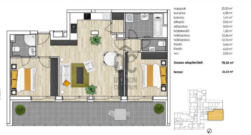 Fedezze fel Budapest 13. kerületének egyik legkeresettebb és legdinamikusabban fejlődő városrészét, Lőportárdűlőt! Ez a frissen átadott, modern lakás ideális választás fiatal felnőttek számára, akik a város szívében szeretnének élni, miközben élvezik a csendes környék nyújtotta előnyöket. Az ingatlan alapterülete 78,55 négyzetméter, amely három tágas szobát, valamint két fürdőszobát kínál, így a családtagok vagy barátok számára is kényelmes életteret biztosít. A lakáshoz tartozik garázs és tároló amelynek ára csomagban 12M forint. A bejárat melletti fürdőszoba az alaprajzon gardróbnak van befejezve de át lehet alakítani második fürdőszobává. A lakás szívét a világos nappali és az amerikai konyha képezi, ahol a közös étkezések és baráti összejövetelek felejthetetlen pillanatai születhetnek. A tágas terasz, melynek mérete 26,65 négyzetméter, csodálatos panorámát nyújt a környező városrészre, így a pihenés és a szórakozás egyaránt megvalósítható a szabadban. A lakás modern fűtési és hűtési rendszere hőszivattyús technológiával működik, amely nemcsak energiatakarékos, hanem kényelmes klímát biztosít az év minden hónapjában. A motoros redőnyök pedig nemcsak a biztonságot növelik, hanem a kényelmet is, hiszen egy gombnyomással szabályozhatja a fényt és a hőmérsékletet. A környék ellátottsága kiváló, hiszen a közelben található boltok, éttermek és kávézók széles választéka várja Önt.A Lehel piac és a WestEnd közelsége miatt a kitűnő közlekedési lehetőségeknek köszönhetően a város bármely része könnyen elérhető, legyen szó akár autós közlekedésről, akár tömegközlekedésről. A környék biztonságos és csendes, ideális helyszín a pihenésre és a mindennapi életre egyaránt. Ez a belvárosi lakás nem csupán egy új otthon, hanem egy lehetőség arra, hogy a város vibráló életét élvezze, miközben a nyugalom szigetén találja magát.Az ingatlan akadálymentesített, így mindenki számára könnyen hozzáférhető, ami különösen fontos lehet a családtagok vagy barátok látogatásakor. Amennyiben felkeltette érdeklődését ez a nagyszerű ingatlan, ne habozzon, keressen bizalommal kérdéseivel! Szívesen állok rendelkezésére, hogy segítséget nyújtsak az ingatlan megtekintésében vagy bármilyen információval kapcsolatban. Az otthonkeresés izgalmas kaland, és én itt vagyok, hogy támogassam Önt ebben a folyamatban!