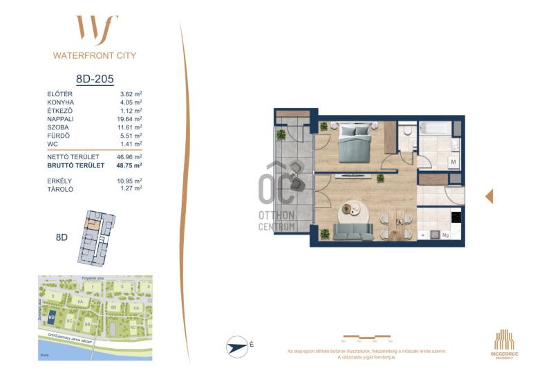Projekt bemutatásaA projektrőlA Waterfront City egy új, modern városnegyed a 3. kerületben, ahol a természet közelsége és a városi kényelem tökéletes egyensúlyban van. A Duna-part közvetlen szomszédságában elhelyezkedő fejlesztés különleges atmoszférát kínál: a sétányt új épületek határolják, üzletekkel, kávézókkal és szolgáltatásokkal, amelyek élhető közösségi teret teremtenek.A 13 emeletes lakóépületből lenyűgöző örökpanoráma nyílik a budai hegyekre és a folyóra, a tágas teraszok pedig ideálisak a pihenéshez vagy a baráti összejövetelekhez. A zöldtetők, parkosított terek és fenntartható megoldások – mint az energiatakarékos rendszerek és okos otthon funkciók – mind hozzájárulnak a modern, környezettudatos életstílushoz.Látogass el értékesítési irodánkba, és tekintsd meg a városnegyed makettjét személyesen! Ismerd meg, milyen lesz az élet Budapest egyik legizgalmasabb új fejlesztésében!Óbuda szívébenKépzeld el, ahogy egy napsütéses délelőttön Óbuda szívében sétálsz, a Duna közelsége frissítően hat rád, miközben a Folyamőr utca, a Miklós tér és a Bogdáni út által határolt, öt hektáros területre érsz. A levegőben ott van a város történelme, mégis minden részletében a jövő hívogat.A 50 000 négyzetméteres területen egy hangulatos sétány vezet végig, amely egyenesen az óbudai Fő térre visz – mindössze 600 méterre. Ez a sétány nem csupán összeköt, hanem élményt nyújt: a Kolosy térről induló Óbudai Promenád részeként a város egyik legélhetőbb, legpezsgőbb szakaszán haladsz végig. És ha biciklivel érkeznél? A nemzetközi kerékpárút is itt halad el, Szentendre felé vezetve.Az 5. ütemben épülő 149 lakás mindegyike egyedi hangulatot kínál. Ahogy belépsz egy-egy otthonba, a hatalmas üvegfelületeken át beáradó fény és a tágas, szellős terek azonnal magukkal ragadnak. A kilátás? A Kaszap István park zöldje nyújt békét, míg a felsőbb emeletekről a Budai-hegység örökpanorámája tárul eléd – minden nap egy új festmény az ablakodban.A 6. ütemben 316 modern lakás épül, tágas teraszokkal és lenyűgöző kilátással a Dunára és a budai hegyekre. A lakók kényelmét őrszolgálat, kamerarendszer, mélygarázs, vendéglátóhelyek, belső park, játszótér és E-autó töltők szolgálják. Ez a projekt utolsó üteme, amely még közvetlen Duna-parti kapcsolattal rendelkezik.