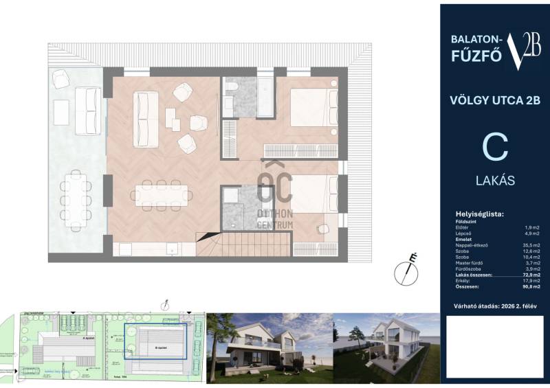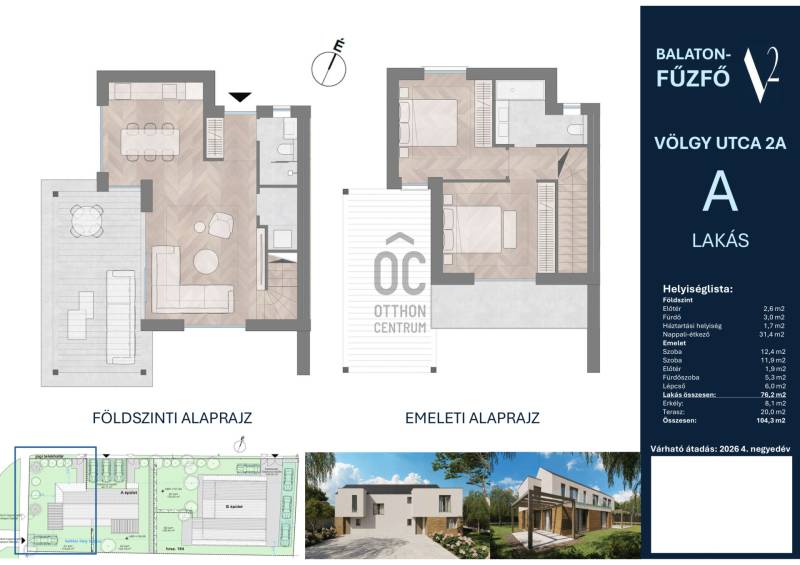 (2026.IV) V2AA ikerház fél: 93,0 m² lakótér + 25,0 m² erkély és terasz, saját kerttel, 129,9 MFt.250 m a Fövenyfürdő strandtól és a kikötőtől,5 lakás épül - kis lakásszámú fejlesztés - két épületben, ebből még 3 lakás elérhető.Földszinti elosztás – jól átgondolt terekkel:-előtér gardróbhellyel (2,6 m²) és belső, privát lépcső (6,0 m²),-tágas, egy légterű nappali–konyha–étkező (31,4 m²) közvetlen (20,0 m²) teraszkapcsolattal, amely délnyugati erkélyre/teraszra nyílik, kiváló helyszín családi vacsorákhoz, napozáshoz, baráti összejövetelekhez.-háztartási helyiség (1,7 m²), -külön fürdőszoba (3,0 m²).Emeleti elosztás – jól átgondolt terekkel:-2 kényelmes hálószoba (12,4 m² és 11,9 m²),-külön fürdőszoba (5,3 m²),-előtér (1,9 m²),-erkély: (8,1 m²).Parkolóhely:-udvari beállóhely: (1db) külön megvásárolható (1,5Mft.)Műszaki tartalom – alacsony rezsi, magas komfort:„A” energetikai besorolású, hőszivattyús rendszerrel,Felület fűtés–hűtés minden helyiségben,Választható, minőségi burkolatok és szaniterek,Téglafalak kívül-belül, korszerű, szigetelt nyílászárók, nappaliban emelő-toló ajtó,Szigetelt falazat és tető, elektromos redőny előkészítéssel,A műszaki megoldások hosszú távon kiszámítható, energiahatékony fenntartást biztosítanak, így a lakás kiváló választás állandó otthonnak is.Finanszírozás, környezet, parkolás:A lakás CSOK igénybevételére alkalmas,Kedvező finanszírozási konstrukciókkal megvásárolható, Balatonfűzfő teljes infrastruktúrával rendelkező, élhető város kevesebb mint 1 órára Budapesttől, Környezetében boltokkal, éttermekkel, vasútállomással rövid sétatávolságon belüli partszakasszal,A telken belül gépkocsi-beálló vásárolható.Elérhető lakások a fejlesztésben:V2BC (ez a lakás): 72,9 m² lakótér + 17,9 m² délnyugati terasz, emeleti lakás, 99,5 MFt,V2AB ikerház fél: 76,2 m² lakótér + 28 m² erkély és terasz, saját kerttel, 119,9 MFt,V2AA ikerház fél: 93,0 m² lakótér + 25 m² erkély és terasz, saját kerttel, 129,9 MFt.Akiknek ajánljuk:Az ingatlan ideális választás mindazoknak, akik a Balaton partján keresnek modern, napfényes, jól kihasználható terekkel rendelkező otthont – akár életvitelszerűen, akár nyaralóként vagy befektetésként.Projekt bemutatásaElérhető lakások a fejlesztésben:V2BC (ez a lakás): 72,9 m² lakótér + 17,9 m² délnyugati terasz, emeleti lakás, 99,5 MFt,V2AB ikerház fél: 76,2 m² lakótér + 28 m² erkély és terasz, saját kerttel, 119,9 MFt,V2AA ikerház fél: 93,0 m² lakótér + 25 m² erkély és terasz, saját kerttel, 129,9 MFt.250 m a Fövenyfürdő strandtól és a kikötőtől,5 lakás épül - kis lakásszámú fejlesztés - két épületben, ebből még 3 lakás elérhető.Parkolóhely:-udvari beállóhely: (1db) külön megvásárolható (1,5Mft.)-udvari beállóhely: (2db) külön megvásárolható (3,0Mft.)-udvari beállóhely: (1db) külön megvásárolható (1,5Mft.)Műszaki tartalom – alacsony rezsi, magas komfort:„A” energetikai besorolású, hőszivattyús rendszerrel,Felület fűtés–hűtés minden helyiségben,Választható, minőségi burkolatok és szaniterek,Téglafalak kívül-belül, korszerű, szigetelt nyílászárók, nappaliban emelő-toló ajtó,Szigetelt falazat és tető, elektromos redőny előkészítéssel,A műszaki megoldások hosszú távon kiszámítható, energiahatékony fenntartást biztosítanak, így a lakás kiváló választás állandó otthonnak is.Finanszírozás, környezet, parkolás:A lakás 3%-os Otthonfelújítási Hitel (Otthon Start) és CSOK igénybevételére alkalmas,Kedvező finanszírozási konstrukciókkal megvásárolható, Balatonfűzfő teljes infrastruktúrával rendelkező, élhető város kevesebb mint 1 órára Budapesttől, Környezetében boltokkal, éttermekkel, vasútállomással rövid sétatávolságon belüli partszakasszal,A telken belül gépkocsi-beálló vásárolható.Akiknek ajánljuk:Az ingatlan ideális választás mindazoknak, akik a Balaton partján keresnek modern, napfényes, jól kihasználható terekkel rendelkező otthont – akár életvitelszerűen, akár nyaralóként vagy befektetésként.