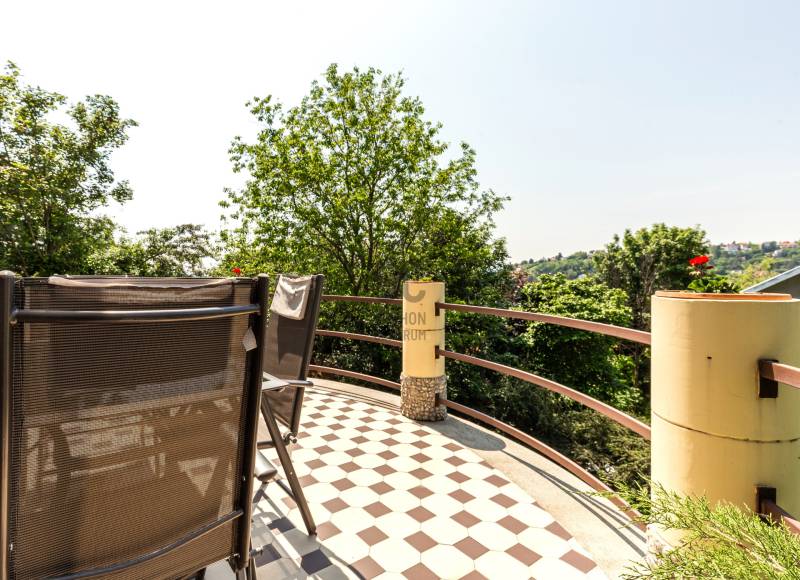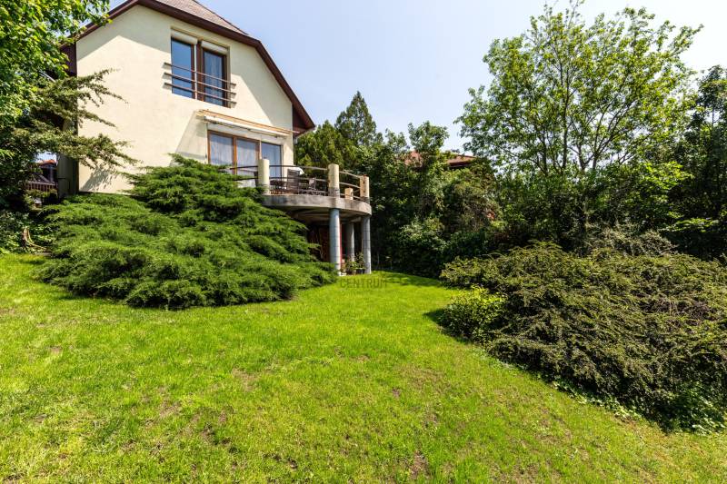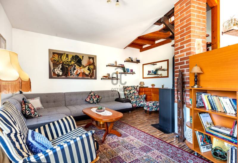 Eladó Szentendre Petyinán, aszfaltozott, örök panorámás, csendes zsákutcában 420 m2 telken, egy egyedi tervek alapján épült 80 nm-es, 10 nm pincei tárolóval, két, összesen 23,5 nm terasszal rendelkező 1+3 (jelenleg 2+1) szobás, 1990-ben épült jó állapotú családi ház. Az épület felújított, korszerűsített, és jól karban tartott. Redőnnyel és szúnyoghálóval is rendelkező nyílászárói termó üvegezésűek, falai szigeteltek, fűtését kondenzációs gáz cirkó biztosítja, de a nappaliban esztétikus és hangulatos kis kályha és hűtő fűtő klímaberendezés is rendelkezésre áll. Beosztását a földszinten előszoba, konyha, étkező, fürdőszoba és tágas nappali, a tetőtérben egy külön wc, két gardrób, és két szoba alkotja, mely szobák egyike eredetileg két félszobát alkotott, a visszaalakítás egyszerűen megoldható. Az egyedi tervezés a tereket apró szinteltolásokkal, valamint a nappaliból és az étkezőből is megközelíthető, összesen 23,5 nm-es terasszal gazdagította. A gondozott kertel rendelkező telken az elektromos kapun át bejutva két autó számára beállóhelyet, a terasz alatti terület beépítésének köszönhetően egy 4, a pincében pedíg egy 6,5 nm-es tárolót is találunk. Fontos, hogy az ingatlan, a Csok-nál kritériumként előírt redukált alapterületi minimum nm-t nem éri el, de otthon startnak megfelel. Ha felkeltettem érdeklődését, várom hívását!