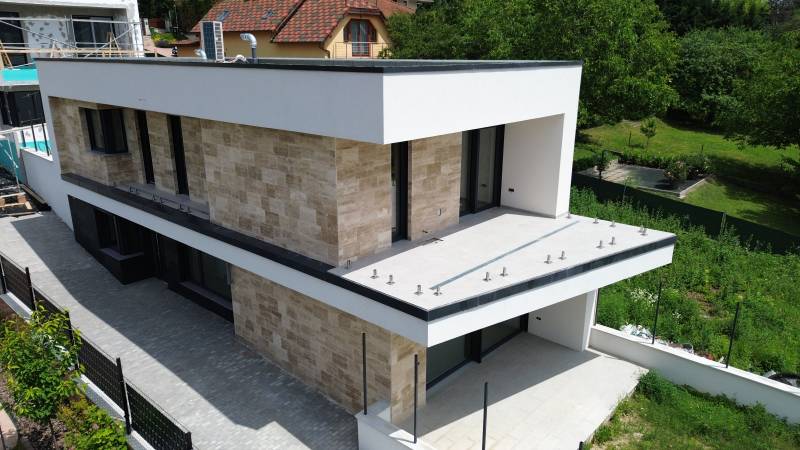 3.ker, Aranyhegyen, jól megközelíthető helyen aszfaltos utcában, panorámás , PRÉMIUM katgóriás 170 m2-es, nappali + 4 szobás +2 félszobás családi ház, nagy múltú beruházótól , dupla garázzsal eladó.A telken 3 db külön álló , szeparált családi ház található.A teljes ház prémium anyagokkal lett megépítve, mind a külső mind a belső tekintetében.Belső építész által tervezett koncepció alapján kerültek kiválasztásra a kiváló minőségű burkolatok, prémium szaniterek és egyedi gépesített konyhabútor.A ház teljesen elkészült, azonnal költözhető. Használatbavétellel is rendelkezik.Az ingatlan fekvése délnyugati, így egész nap világos.Földszinten található:Előtér, vendégszoba/dolgozószoba, zuhanyzó, gépészet-mosókonyha, amerikai konyhás nappali.Emeleten:Közlekedő, 1 master bedroom saját fürdővel és gardróbbal, 2 további hálószoba, 1 fürdőszoba.A ház paraméterei:- nettó lakótér: 131m2- teraszok: 42m2- dupla garázs: 36m2 (benne van az árban)Műszaki tartalom:- Gépészet: hőszivattyú, melegvíz tartállyal, mennyezet fűtés és hűtés, padlófűtés.- Szellőztető rendszer, párásítással és szárító funkcióval.- Vízlágyító.- Konyhai szellőzés tető fölé vezetve.- Elektromos törölköző szárító radiátoroknak kiépítés.- Kertben kerticsapnak kiállás.- Szülői háló teraszán elektromos és gépészeti kiállás jakuzzinak.- Okosotthon rendszer kiépítve. TAP Home rendszer.- Külső elektromos kiállások.- Hofstädter prémium ablakok és bejárati ajtó, zsalúzia minden ablakon.- Prémium belső burkolatok, a parketta mindenhol szalagparketta (Bécsi parketta) – nem laminált.- Belső nyílászárók valódi fa furnérozott ajtók (Porta door), nem fóliázott ajtók.- Szaniterek (kád, zuhany, mosdók, wc-k), prémium márkák (Grohe, Ravak), a mosdószekrények is beépítésre kerültek.- A riasztó rendszernek kiépítve a kábelezése, a nyílászárókban nyitásérzékelő kiépítve.- Teraszokon Üvegkorlát került elhelyezésre mindenhol.- Az összes belső lámpa beépítésre került.- A konyha is beépítésre került, a hűtő kivételével az összes gépet is tartalmazza.- Külső homlokzatra Travertin és Antracit Brazil pala kőburkolat került felhelyezésre.- 15 cm – grafitos hőszigetelés a falakon és erkélyeken.- Tetőn 22cm + hőszigetelés. A padló alatt 12 cm hőszigetelés.A kiváló energetikai tulajdonságoknak köszönhetően az üzemeltetési költségek rendkívül alacsonyak!VÁROM HÍVÁSÁT, AKÁR HÉTVÉGÉN IS, MINDEN NAP REGGEL 8-TÓL ESTE 10-IG.