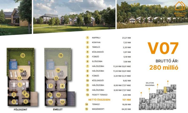 Balatonföldvár: Balatonföldvár fontos turisztikai célpont, nemcsak a magyarok, hanem más európai országok turistái számára is, természeti szépségei (például a löszhegy és a nagy virágos parkok), továbbá történelmi örökségei (például a kelta ösvény, a régi kúriák és villák) miatt számtalan szabadidős lehetőséget, valamint számos vízi sportot (vitorlázás, szörfözés, horgászat, evezés)Villák - kulcsrakész alapfelszereltség:100% tömör CLT Ausztriából.20 cm kőzetgyapot hőszigetelés.A+ energetikai besorolás.Fa hőszigetelő nyílászárók 3 rétegű üvegezéssel, tölgyfurnér melegburkolat.Porcelán greslap hidegburkolat.Villeroy fürdőszoba szaniterek,padlófűtés.Levegős hőszivattyú (VRV splitklíma), 2,5 kW napelem rendszer, elektromos redőny, szúnyogháló, beépített bútorok, homlokzati díszvilágítás.min. 16 m² teraszmin. 65 m² magánkert.Villák - választható opciók:Prémium konyhabútor konyhaszigettel, okosotthon rendszer, szauna (épületen belül), látvány design kandalló, 4 személyes prémium jacuzzi, gázos grillsütő.Privát zárt parkoló: 6.350.000. Ft.Privát elektromos autótöltő, kedvezményes hajóhely az új e-kikötőben.V. 07.A további kérdésekkel és a megtekintéssel kapcsolatban kérem keressen a megadott mobil számon.