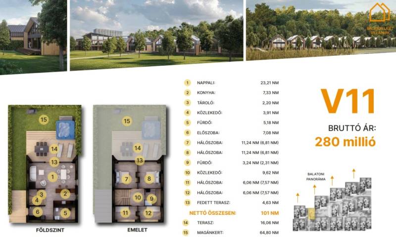 Balatonföldvár: Balatonföldvár fontos turisztikai célpont, nemcsak a magyarok, hanem más európai országok turistái számára is, természeti szépségei (például a löszhegy és a nagy virágos parkok), továbbá történelmi örökségei (például a kelta ösvény, a régi kúriák és villák) miatt számtalan szabadidős lehetőséget, valamint számos vízi sportot (vitorlázás, szörfözés, horgászat, evezés)Villák - kulcsrakész alapfelszereltség:100% tömör CLT Ausztriából.20 cm kőzetgyapot hőszigetelés.A+ energetikai besorolás.Fa hőszigetelő nyílászárók 3 rétegű üvegezéssel, tölgyfurnér melegburkolat.Porcelán greslap hidegburkolat.Villeroy fürdőszoba szaniterek,padlófűtés.Levegős hőszivattyú (VRV splitklíma), 2,5 kW napelem rendszer, elektromos redőny, szúnyogháló, beépített bútorok, homlokzati díszvilágítás.min. 35 m² teraszmin. 47 m² magánkert.Villák - választható opciók:Prémium konyhabútor konyhaszigettel, okosotthon rendszer, szauna (épületen belül), látvány design kandalló, 4 személyes prémium jacuzzi, gázos grillsütő.Privát zárt parkoló: 6.350.000. Ft.Privát elektromos autótöltő, kedvezményes hajóhely az új e-kikötőben.V.11.A további kérdésekkel és a megtekintéssel kapcsolatban kérem keressen a megadott mobil számon.