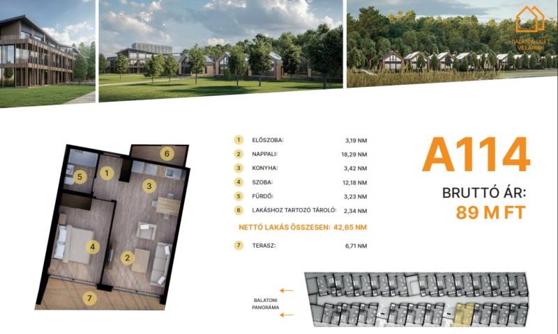 Balatonföldvár: Balatonföldvár fontos turisztikai célpont, nemcsak a magyarok, hanem más európai országok turistái számára is, természeti szépségei (például a löszhegy és a nagy virágos parkok), továbbá történelmi örökségei (például a kelta ösvény, a régi kúriák és villák) miatt számtalan szabadidős lehetőséget, valamint számos vízi sportot (vitorlázás, szörfözés, horgászat, evezés)Balaton liget willapark:Lakások száma: 56 db.Alapterület: 28-56 m².A földszinti lakásokhoz saját, privát kert tartozik.A földszinten 21 lakás található, 48–110 m² közötti alapterülettel.Az első emeleten további 21 lakás érhető el, 47–75 m² közötti méretben.A második emeleten 17 lakás kapott helyet.A lakásokhoz önálló tárolóhelyiségek tartoznak, amelyek a közös folyosóról közelíthetők meg.Környezettudatos építő anyagokA+ energetikai besorolásFelszíni parkoló: 6.350.000. Ft.Modern letisztult építészet, tömegformálás, Balatonra tájolt panorámás teraszok.Apartmanlakás - alapfelszereltség:100% tömör CLT Ausztriából.20 cm kőzetgyapot hőszigetelés.Fa hőszigetelő nyílászárók 3 rétegű üvegezéssel,tölgyfurnér melegburkolat.Porcelán greslap hidegburkolat, villeroy fürdőszoba szaniterekpadlófűtés.Levegős hőszivattyú (VRV splitklíma), 50kW társasházi napelemrendszer, elektromos redőny, szúnyogháló beépített bútoroksaját terasz.A 114. lakás.A további kérdésekkel és a megtekintéssel kapcsolatban kérem keressen a megadott mobil számon.