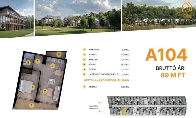Balatonföldvár: Balatonföldvár fontos turisztikai célpont, nemcsak a magyarok, hanem más európai országok turistái számára is, természeti szépségei (például a löszhegy és a nagy virágos parkok), továbbá történelmi örökségei (például a kelta ösvény, a régi kúriák és villák) miatt számtalan szabadidős lehetőséget, valamint számos vízi sportot (vitorlázás, szörfözés, horgászat, evezés)Balaton liget willapark:Lakások száma: 56 db.Alapterület: 28-56 m².A földszinti lakásokhoz saját, privát kert tartozik.A földszinten 21 lakás található, 48–110 m² közötti alapterülettel.Az első emeleten további 21 lakás érhető el, 47–75 m² közötti méretben.A második emeleten 17 lakás kapott helyet.A lakásokhoz önálló tárolóhelyiségek tartoznak, amelyek a közös folyosóról közelíthetők meg.Környezettudatos építő anyagokA+ energetikai besorolásFelszíni parkoló: 6.350.000. Ft.Modern letisztult építészet, tömegformálás, Balatonra tájolt panorámás teraszok.Apartmanlakás - alapfelszereltség:100% tömör CLT Ausztriából.20 cm kőzetgyapot hőszigetelés.Fa hőszigetelő nyílászárók 3 rétegű üvegezéssel,tölgyfurnér melegburkolat.Porcelán greslap hidegburkolat, villeroy fürdőszoba szaniterekpadlófűtés.Levegős hőszivattyú (VRV splitklíma), 50kW társasházi napelemrendszer, elektromos redőny, szúnyogháló beépített bútoroksaját terasz.A 104. lakás.Kedvező fizetési konstrukció: 10-90 %.A további kérdésekkel és a megtekintéssel kapcsolatban kérem keressen a megadott mobil számon.