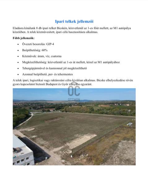 Építse fel telephelyét Győr és Budapest között! – Ipari/Kereskedelmi közművesített telkek eladók!Ez egy kiváló adottságú terület, hiszen az 1-es főút közvetlen közelében, Győr és Budapest tengelyén fekszik, ami kereskedelmi vagy logisztikai szempontból aranybánya.Biatorbágy nagyon közel, illetve Esztergom is rövid időn belül érinthető.Eladásra kínálunk egy összesen közel 2,9 hektáros (28.868 m²) egybefüggő területet, amely 8 külön helyrajzi számmal rendelkező telekből áll. Az ingatlan stratégiai elhelyezkedése verhetetlen: közvetlen kapcsolatot kínál az 1-es főúthoz, 800 méterre az M1 autópálya lehajtójától, ezáltal Győr és Budapest irányába is gyors hozzáférést biztosít.Főbb paraméterek:• Összterület: 28.968 m² (Telekméretek: 2.966 m² – 4.021 m² között).• Állapot: Rendezett, sík terület, azonnal tervezhető.• Potenciál: Telephely, logisztikai központ, raktározási cél, bemutatóterem vagy ipari fejlesztés céljára is ideális.• Megközelíthetőség: Kamionnal és tehergépjárművel is könnyen megközelíthető, kiépített aszfaltozott bekötőút mellett.• Közművek: Áram, Víz, Csatorna• ÖVEZETI besorolás: GIP-4• BEÉPÍTHETŐSÉG: 60%Az ingatlanok külön-külön vagy igény szerint összevonva is megvásárolhatóak.1. 2.966 m² (Saroktelek, kiváló láthatóság)2. 3.851 m²3. 3.904 m²4. 3.966 m² (Budapest felőli szélső telek)5. 3.983 m²6. 4.021 m²7. 3.087 m²8. 3.090 m²A fotók között árazva van az összes telek külön- külön is.Mégegyszer, miért is érdemes?✅ Villany, Víz, Csatorna már elkészült!✅ Kamionos megközelíthetőség aszfaltozott útról✅ Sík, jól alakítható területek✅ Közvetlen főúti kapcsolat✅ Akár egyben, akár külön is megvásárolhatóIdeális raktározásra, gyártásra vagy kereskedelmi tevékenységre. Rugalmas hasznosíthatóság, kitűnő közlekedési infrastruktúra!Ragadja meg a lehetőséget, és építse fel vállalkozása központját a régió egyik legforgalmasabb tranzitútvonala mentén!Abszolút friss megbízás a piacon.Hívjon még ma, nehogy lemaradjon róla.További információkért, keressen bizalommal a hét bármely napján!A vételárat ÁFA fizetési kötelezettség terheli.