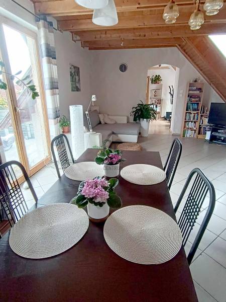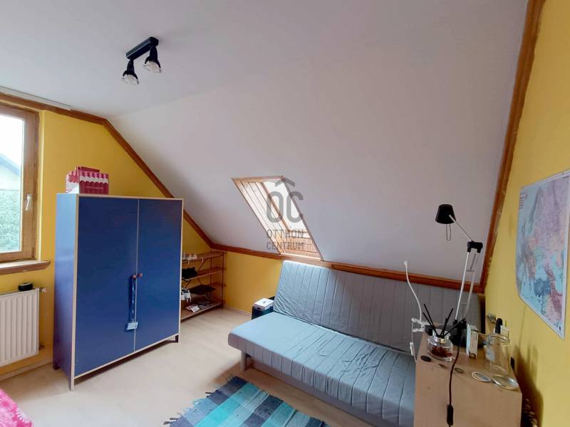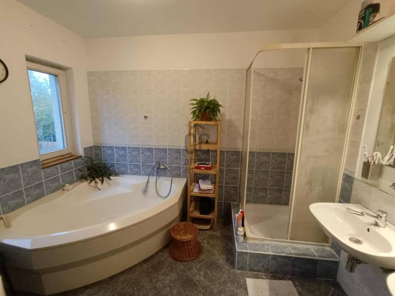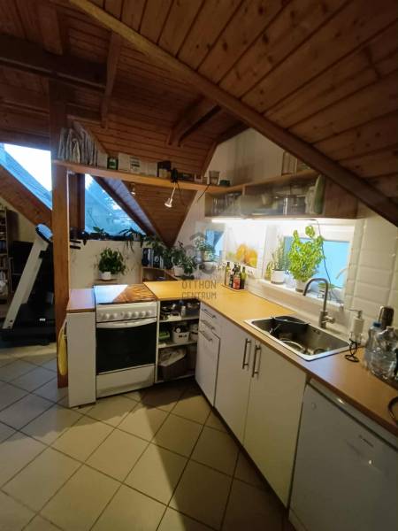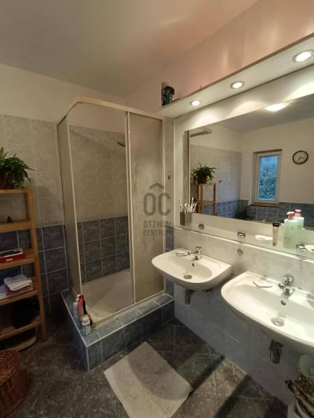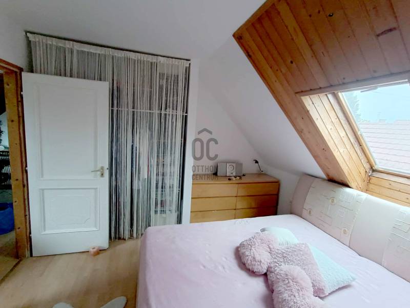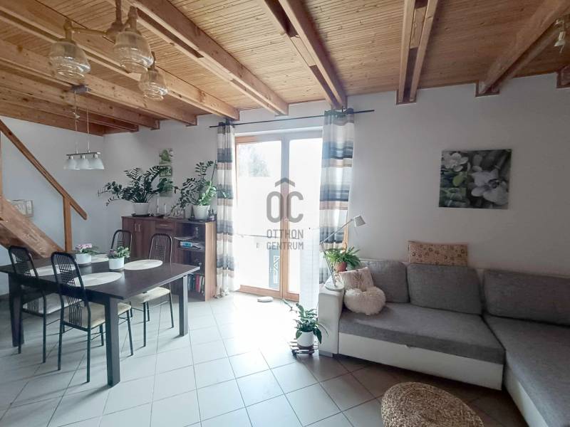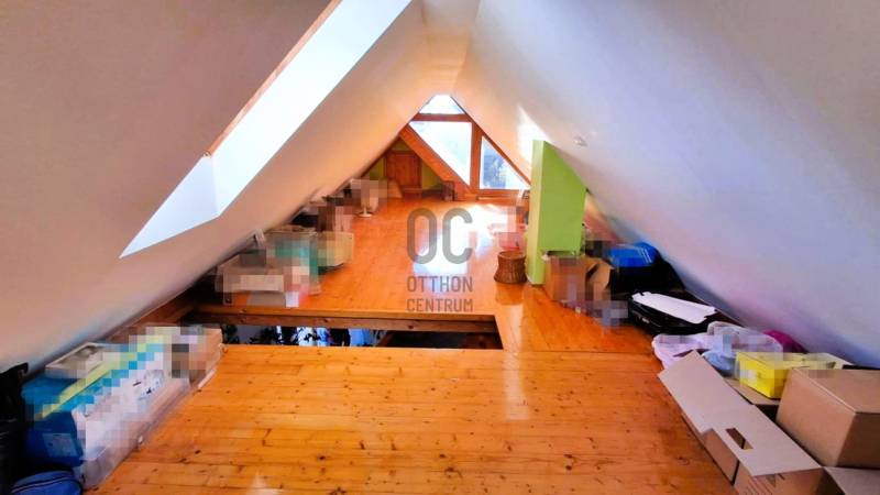 Budakalász kertvárosi részén, Szent István-telepen eladó kétgenerációs családi ház csendes, nyugodt utcában.A ház terméskő lábazattal, fa és műanyag nyílászárókkal, nyeregtetős kialakítással és cserépfedéssel készült. A tetőtér duplán szigetelt, így télen és nyáron is kellemes hőérzetet biztosít.Az ingatlan két, külön bejáratú lakrészből áll, összesen 180 m² alapterülettel.Az alsó szint kb. 80 m², elrendezése: nappali + 2 szoba. A falak mozgathatók, így igény szerint könnyen átalakítható. Tágas, ablakos étkezős konyhája és a télikert nagy ablakai világos, otthonos hangulatot teremtenek. Ez a szint felújítandó állapotú.A felső lakás (kb. 100 m²) zárt lépcsőházon keresztül közelíthető meg. Tágas, közel 40 m²-es amerikai konyhás nappali világos és jól berendezhető, emellett kamra és dolgozósarok is növeli a kényelmet. Három külön nyíló hálószoba és ablakos fürdőszoba található ezen a szinten.A beépített tetőtér egybefüggő, világos teret kínál, amely kis kreativitással akár játszószobával, dolgozótérré vagy vendégszobává alakítható.A fűtést gázkazán biztosítja radiátorokkal, a használati melegvizet villanybojler (éjszakai áramról), illetve a felső szinten kondenzációs kombi cirkó szolgáltatja, radiátoros és padlófűtéses rendszerrel.A 710 m²-es telken dupla garázs, tárolók, veteményeskert, gyümölcsfák, valamint kellemes, grillezésre és sütögetésre kialakított kerti rész található.Az ingatlan kiváló választás gyermekes vagy kétgenerációs családoknak, akik csendes, biztonságos környezetben keresnek otthont Budakalászon.Otthon Felújítási támogatásra és hitelre is alkalmas, hitelezhető.