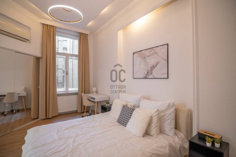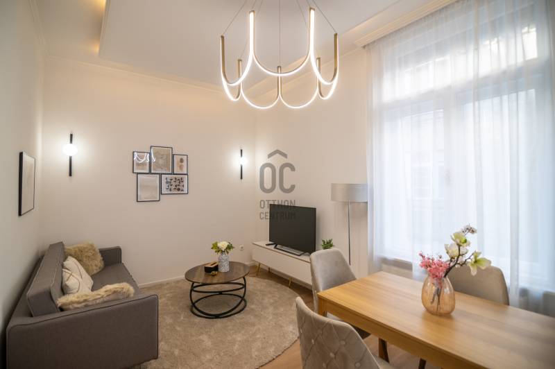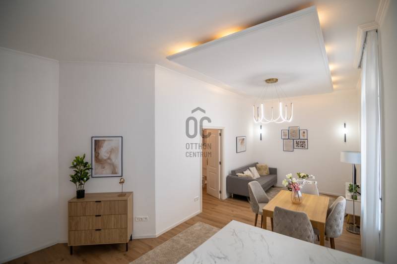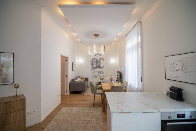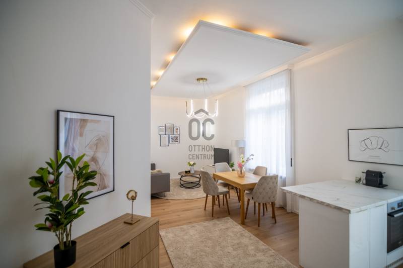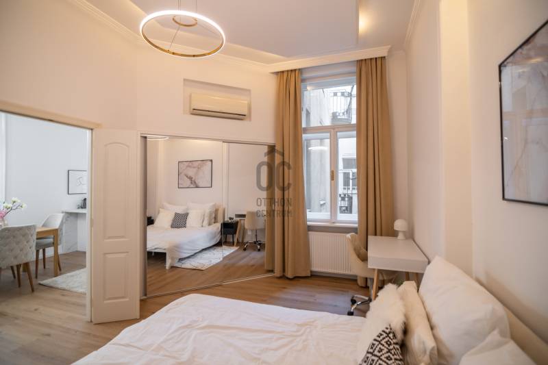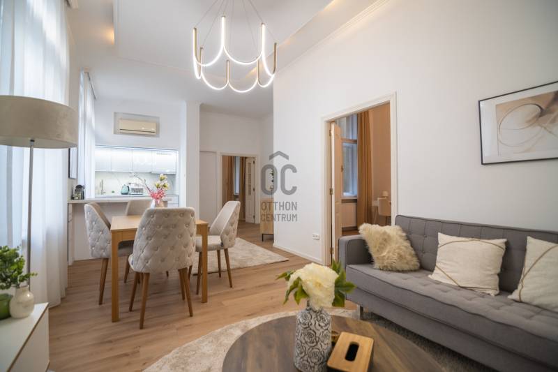 Budapest belvárosának egyik hangulatos V. kerületi sétálóutcájában, a Haris köz patinás épületében kínálok eladásra egy 57 nm-es, 2 szobás, 2. emeleti lakást. Az ingatlan egy rendezett, kis lakóközösségű társasházban található, amely zárt lépcsőházzal és lifttel rendelkezik. A lakás frissen felújított állapotú, tágas terekkel és nagy belmagassággal, így világos és különleges hangulatú otthont kínál új tulajdonosának.A LAKÁSRÓL:Az ingatlan a nagy belmagasságának köszönhetően rendkívül tágas és világos érzetet nyújt.A nappali a sétálóutcára néz, míg a hálószoba a csendes belső udvarra, így a lakás jól ötvözi a városi hangulatot és a nyugodt pihenést.A lakás frissen felújított, az ablakok extra hangszigeteléssel vannak ellátva, így a központi elhelyezkedés ellenére is csendes.A konyha teljesen gépesített, a lakásban két klímaberendezés is található, amelyek a nyári hűtést és az átmeneti időszakban a fűtést is segítik. A fűtésről cirkó gázkazán gondoskodik.A lakásban található bútorok megegyezés tárgyát képezik.A HÁZRÓL:A társasház kis lakóközösségű, rendezett, zárt lépcsőházzal rendelkezik, valamint lift is található az épületben, ami még kényelmesebbé teszi a mindennapokat.LOKÁCIÓ:Az ingatlan Budapest belvárosában, a Haris közben található, egy csendes, hangulatos sétálóutcában. A Váci utca, a belváros egyik legismertebb bevásárló- és sétálóutcája, mindössze pár perc sétára, a Haris köz párhuzamos utcájában helyezkedik el, így a lakó mindennapi bevásárlása és a városi élet könnyen elérhető. A környék rendkívül frekventált, számos étterem, kávézó, üzlet és szolgáltatás található a közelben. A tömegközlekedés kiváló, a környéken busz- és villamosjáratok, valamint a metróvonalak könnyen elérhetők, így a város bármely pontja gyorsan megközelíthető. A lakás ideális azok számára, akik szeretnének közel lenni a belváros nyüzsgéséhez, ugyanakkor csendes és nyugodt otthont keresnek.AJÁNLOM:Ideális választás lehet saját otthonnak, városi lakásnak vagy befektetésnek egyaránt.További információért és megtekintés egyeztetéséhez keressen bizalommal!Egyedi igényekre szabott lakáshitelekkel állunk rendelkezésére.Bankfüggetlen Hitelcentrumunk az országban elérhető összes bank és hitelintézet ajánlatát versenyezteti az Ön számára díjmentesen.Munkatársaink nagy szakmai tapasztalattal, teljes körű CSOK PLUSZ és OTTHON START PROGRAM ügyintézéssel várják Önt előre egyeztetett időpontban akár a normál munkaidő után is.