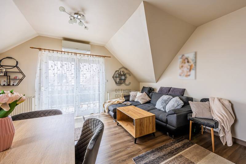 A 2005-ben épült tégla lakás a népszerű ALAGLIGET LAKÓPARKBAN található.Az INFRASTRUKTÚRA kiváló, a környék rendezett, a szomszédság barátságos, családias.A ház ZÁRT közös KERTJÉBEN KÉT JÁTSZÓTÉR is van, ahol a gyerekek biztonságban játszhatnak.A kimondottan JÓ ELOSZTÁSÚ, TÁGAS otthon ragyogó állapotban van.Fekvésének köszönhetően télen is VILÁGOS, nyáron pedig nincs hőség.EXTRÁK: szúnyogháló, redőny, hűtő-fűtő inverteres klíma, riasztó kiállás, beépített előszobai, fürdőszobai és kamra szekrény, aktív szenes beépített vízszűrő,kimondottan alacsony rezsi, két erkély.Az elmúlt 2 évben A LAKÁS FEL LETT ÚJÍTVA:-új laminált padló,-tetőtéri ablak, -napelemes, elektromos redőny,-új fürdőszoba bútor,-egyedi készítésű mosókonyha bútor,-1 éves új beépített sütő (electrolux) és mosogatógép (bosch) a konyhában,-2 db hűtő-fűtő klíma (Samsung és Mitsubishi)A lakás HELYISÉGEI: amerikai konyhás nappali, két különnyíló hálószoba, fürdőszoba, háztartási helyiség, külön wc.Minden szoba NAGY ABLAKOS, fenyőfákra, vagy rendezett lakóparki környezetre néz és KÉT SZOBÁNAK is van SAJÁT TERASZA.A lakás RÉSZBEN TETŐTÉRI, az egyik hálószoba oldalfala és a nappalinak a sarka csapott, így a nettó 63 nm bruttóban 68 nm-t tesz ki.Az összes többi fala egyenes, amitől tágas, JÓL BERENDEZHETŐ.A TETŐTÉR ELŐNYEI:-A csapott résznél \"hiányzó\" légteret NEM KELL BEFŰTENI, ami csökkenti a rezsinket.-A közel 70 nm-es lakás nettóban 63nm (58+fél terasz), így KEVESEBB A KÖZÖS KÖLTSÉG, hiszen azt csak a nettó terület után kell fizetni.-Tetőtéri lakás mindig KUCKÓS, HANGULATOS, ROMANTIKUS, mivel általában a legfölső szinten van, ahová nem jön más.-Fölső szint lévén KÖRBE SÜTI A NAP, ami szintén a téli fűtés számlát csökkenti.Ez a lakás nagyon jól kereszt-huzatolható, szellőztethető, így a nyári hőség sem jelent gondot, a KLÍMÁT szinte nem is kell használni.A lakáshoz EGY ZÁRT ÉS EGY NYITOTT TÉRKÖVEZETT beálló is tartozik.A lakás FENNTARTÁSA KEDVEZŐ, a TELJES REZSI télen 28e, nyáron pedig mindössze 18 ezer forintból kijön!!!A konyhabútor gépekkel a vételár részét képezi.5 perc sétán belül van az új általános iskola, ovi, bölcsi, játszótér, kisbolt, gyógyszertár, háziorvosi rendelő és az ingyenes buszjárat, amely a vasútállomásra visz. 2 perc sétára van pékség, zöldséges, közért, cukrászda, pizzéria, termelői piac.Autóval 5-7 percen belül hipermarketek és minden egyéb elérhető.M2, M0, M3 néhány perc alatt elérhető.Hívjon bizalommal a hét bármely napján!Ez az ingatlan a \"Felező csomag\" megbízási portfólióhoz tartozik. Részletek az Otthon Centrum weboldalán.