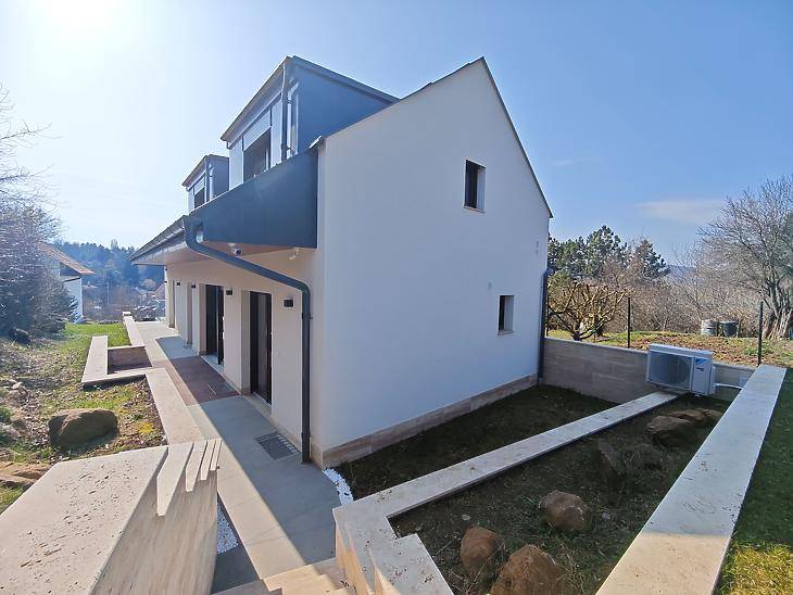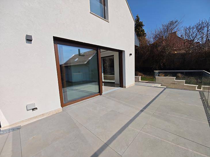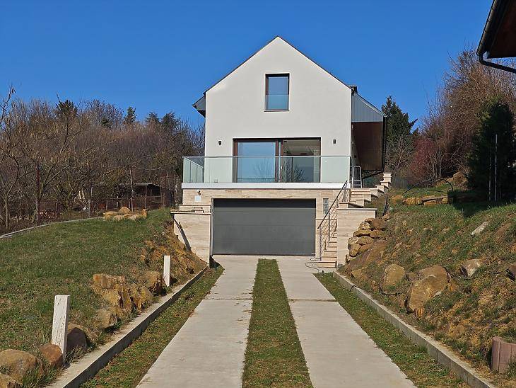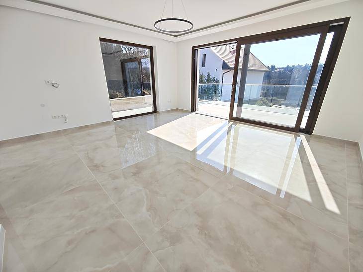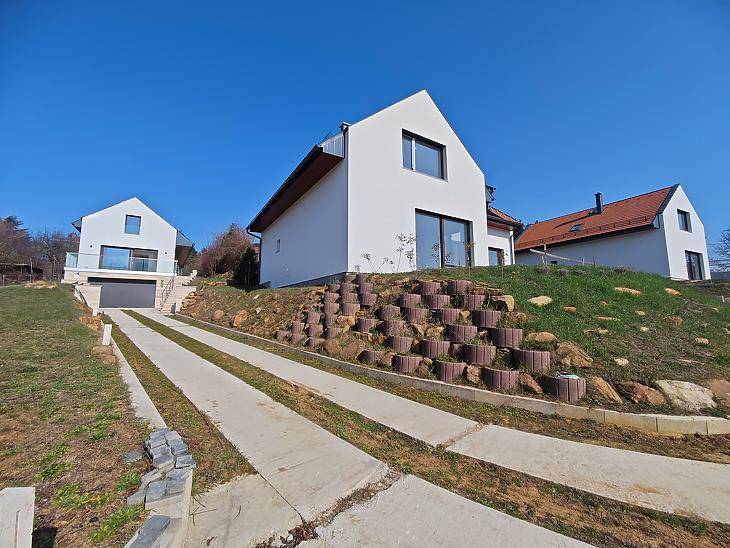Panorámás, új építésű családi ház eladó Pesthidegkúton!Budapest II. kerületének egyik legkedveltebb, csendes részén, Pesthidegkút-Ófalu hangulatos zsákutcájában, kínálunk megvételre egy 2025-ben épült, 3 épületből álló villaparkban, magas műszaki tartalommal rendelkező, lenyűgöző panorámás családi házat.Az ingatlan egy 742 nm-es, kizárólagos használatú telken épült, ahol a nyugalom és a természet közelsége találkozik a modern műszaki megoldásokkal. Az építéskor külön figyelmet kaptak a természetes anyagok, így a kültérben mindenhol Travertin mészkő található. A háromszintes otthon építése során minőségi anyagok és korszerű technológiák kerültek beépítésre. A ház 30 cm-es Porotherm téglából készült, melyet 15 cm grafit hőszigetelés egészít ki, a födém pedig 20 cm vastag monolit vasbeton.A háromrétegű hőszigetelt nyílászárók, alumínium küszöbökkel és párkányokkal, valamint a motoros, színezett alumínium redőnyök biztosítják az energiahatékonyságot és a kényelmet. A garázsban Hörmann szigetelt, motoros szekcionált garázskapu került beépítésre.Az otthon energiahatékony működéséről modern Daikin hőszivattyús rendszer gondoskodik, padló- és mennyezeti hűtés-fűtéssel, míg a kellemes beltéri levegőt Wolf hőcserélős szellőztetőrendszer biztosítja, még a garázsban is.A ház tisztántartásáról központi porszívó gondoskodik, a biztonságról pedig a riasztórendszer és külső kamerák.HelyiségekAlsó szint – 92,92 nm• 43,63 nm-es dupla garázs• háztartási és gépészeti helyiség• 2 tároló• fürdőszoba• központi porszívó rendszerInnen belső lépcső vezet a nappali szintre.Nappali szint – 79,31 nm + 27,36 nm terasz• teraszkapcsolatos, panorámás nappali nagy üvegfelületekkel• étkezős konyha, külön terasszal• szoba• előszoba• fürdőszoba• közlekedőErről a szintről már páratlan panoráma tárul elénk, amely a 19,5 nm-es teraszról is élvezhető.Emelet – bruttó 81,50 nm / nettó 59,57 nm• 2 hálószoba• fürdőszoba• tágas közlekedőA hátsó, intim kert kiválóan alkalmas grillező, pihenőkert vagy akár wellness rész kialakítására.ElhelyezkedésA ház ideális választás azok számára, akik csendes, zöld környezetben szeretnének élni, mégis fontos számukra a jó infrastruktúra.Tömegközlekedés 5 perc, míg a Széphalom bevásárló 10 perc sétára található. Ez az ingatlan ritka lehetőség: egy exkluzív, panorámás, modern családi ház Budapest egyik legnyugodtabb utcájában.