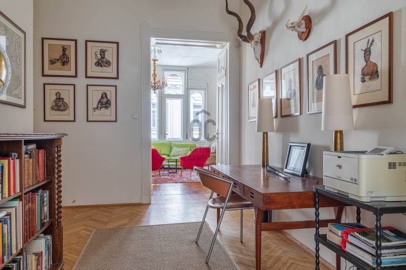 A belvárosban ritkán találni olyan nagypolgári lakást, ami egyszerre őrzi a klasszikus értékeket és valóban élhető, világos tereket kínál. Magas emelet, erkély, hatalmas ablakok és egy időtálló elegancia – ez a lakás pontosan ezt adja. Üdv itthon!RÖVID ÖSSZEFOGLALÓBudapest V. kerületében, a Veres Pálné utcában, a Fővám tér közelében, liftes társasház magas emeletén kiadó egy 113 m²-es + 3,8 m² erkélyes, nappali + 2 hálószobás, külön konyha-étkezős, 2 fürdőszobás, napfényes, klasszikus polgári lakás.Miért pont ez a lakás?- Nagypolgári hangulat: 4,2 m belmagasság, halszálkás parketta, díszes nyílászárók- Közel 36 m²-es nappali, 4 hatalmas ablakkal- Erkélyes – ritkaság ezen a környéken- Kiváló elosztás, akár külön lakrész is kialakítható- Világos, keleti tájolás – reggeli napfény az egész lakásban- Liftes, rendezett házOTTHONA lakás nagy alapterületének és átgondolt elrendezésének köszönhetően kényelmes, jól használható tereket kínál. A funkciók logikusan elkülönülnek, mégis egységes, áramló térérzet jellemzi.Az előszobából egy tágas közlekedő nyílik, amely dolgozóként is jól használható. Ebből érhető el a vendég fürdőszoba, amelynek különlegessége az eredeti, festett ólomüveg, így természetes fényt kap a lépcsőház felől.A nappali a lakás központi tere: közel 36 m² alapterületű, 4,2 méteres belmagassággal. Négy nagyméretű ablak néz a Veres Pálné utcára, keleti tájolásának köszönhetően reggel napfényben úszik. Az erkély a nappaliból nyílik, ahonnan hangulatos belvárosi panoráma tárul elénk: tetők, templom és a Veres Pálné utca karakteres látványa.A nappali két oldalán helyezkednek el a hálószobák, így jól szeparált, mégis egységes térszerkezet alakul ki. A kisebb hálószoba az étkező felől közelíthető meg, és saját fürdőszobával rendelkezik, így önálló egységként is használható. A nagyobb, 21 m²-es hálószoba tágas, jól berendezhető. TÁRSASHÁZA ház liftes, azonban a lift a földszintről néhány lépcsőn keresztül érhető el. A lakás a függőfolyosó elején helyezkedik el, közvetlenül a lépcsőház és a lift közelében.A közös költség 48 000 Ft, amely tartalmazza a szemétszállítást, lift karbantartást, takarítást és a felújítási alapot. Minden egyéb fogyasztás egyedi mérés alapján fizetendő. A fűtés modern, elektromos rendszerrel megoldott: a hidegburkolt helyiségekben padlófűtés, a többi helyiségben radiátoros hőleadás működik.LOKÁCIÓ – DÉL-BELVÁROSEz a környék Budapest egyik legélhetőbb része. Pár perc sétára a Duna-part, a Vásárcsarnok, kiváló éttermek és kávézók találhatók. A Szabadság híd és a Gellért-hegy közelsége miatt a mindennapok része lehet egy esti séta vagy kikapcsolódás.Kiváló közlekedés:- 47–49 villamos- M3, M4 metró, minden pár percen belül elérhetőMilyen feltételekkel bérelhető az ingatlan?- minimum 12 hónap- 2 havi kaució- gyerek és kisállat megengedett- dohányzás kizárólag az erkélyen- azonnali költözésHa egyedi, karakteres otthont keresel, amit nem jön szembe minden sarkon, akkor megtaláltad.Keress bátran és egyeztessünk megtekintési időpontot!----------------------------------------------A hirdetésben szereplő információk tájékoztató jellegűek. A tévedés és az árváltoztatás jogát fenntartjuk. Az esetleges elírásokért és technikai hibákért felelősséget nem vállalunk.