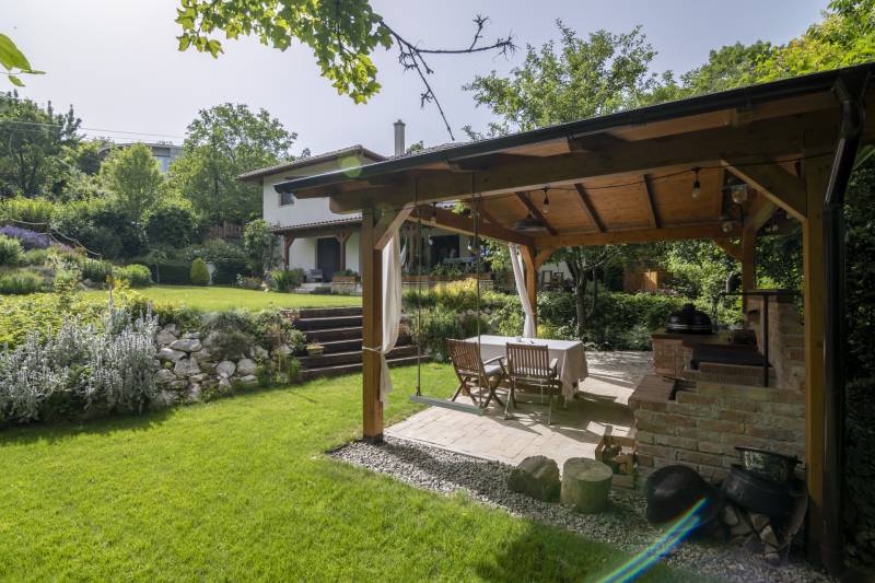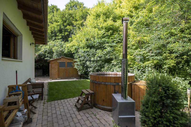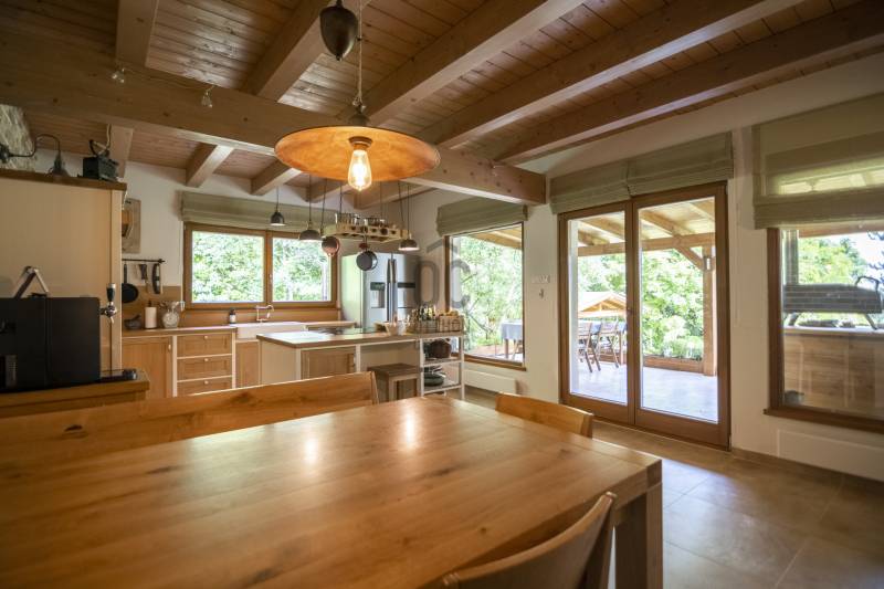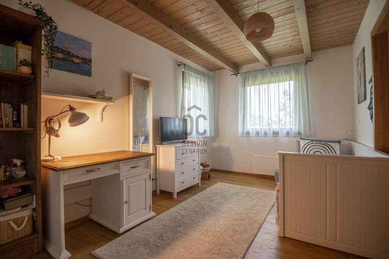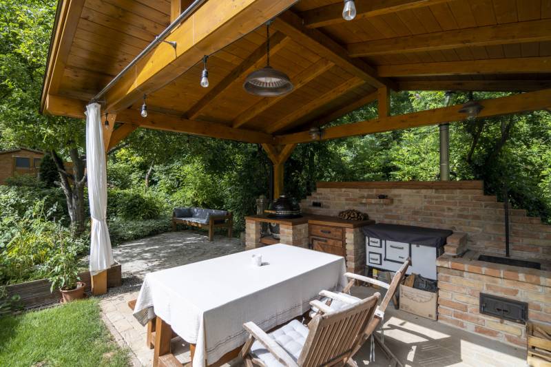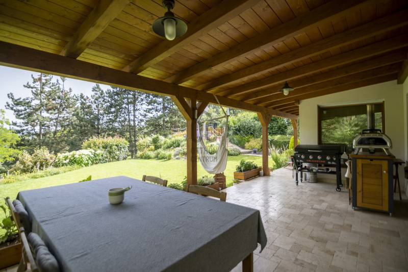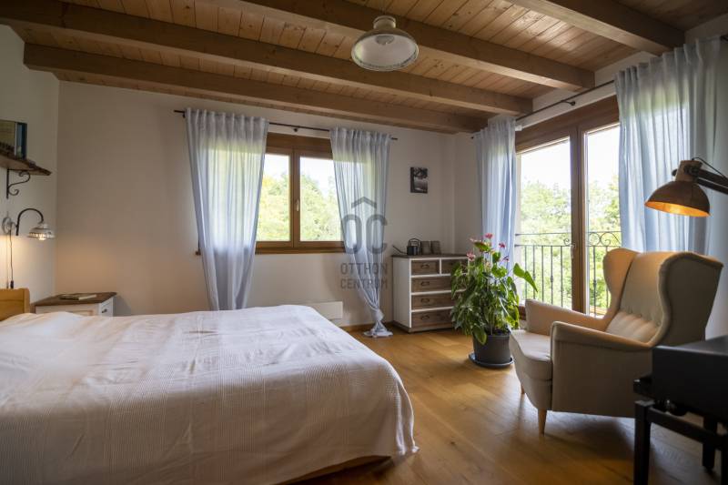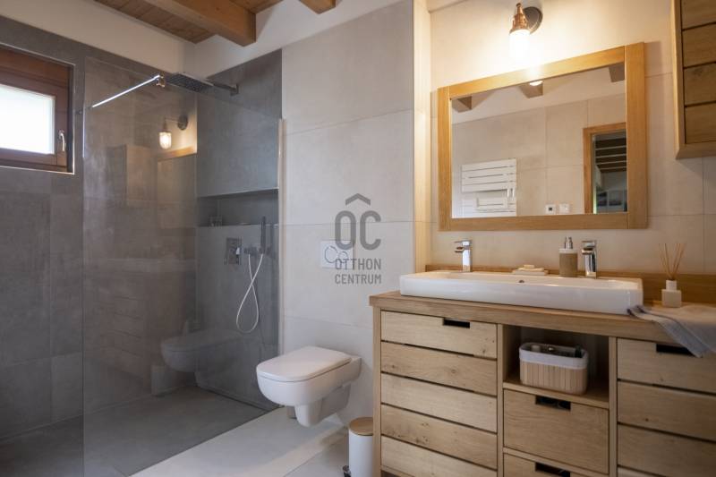 Erdőszéli, prémium hangulatú családi ház eladó Nagykovácsiban – intim kerttel, különleges extrákkalNagykovácsi egyik legnyugodtabb, legszebb részén, a Cseresznyés városrész csendes zsákutcájának végén kínálunk megvételre egy 2019-ben épült, 156 nm-es, teraszos családi házat, közvetlen erdőkapcsolattal és gondosan kialakított, intim kerttel, nyárikonyhával.Ez az otthon tökéletes választás azok számára, akik a természet közelségét keresik kompromisszumok nélkül.✨ Főbb jellemzők156 nm lakótérTágas nappali–konyha–étkező egy légtérben3 külön nyíló szoba + gardrób2 fürdőszobaPanorámás franciaerkély kovácsoltvas korláttalHangulatos nyárikonyha, szaletli bográcsozóval és sparhelttelBaltresto thermowood fürdődézsa (fa + elektromos fűtéssel, szűrőrendszerrel)Két külön tárolóAutomata öntözőrendszerMotoros alumínium redőnyök szúnyoghálóvalRiasztórendszer, biztonsági szolgálathoz bekötve???? Műszaki tartalomÉpítés éve: 2019Szerkezet: korszerű favázas könnyűszerkezetKiemelkedő szigetelés: 120 mm EPS + 150 mm ásványgyapot→ nyáron hűvös, télen gyorsan és gazdaságosan fűthetőHáromrétegű fa nyílászárókPrémium burkolatok: tömör tölgy padló és lépcső, fa födém, mészkő teraszFűtés:programozható, online vezérelhető elektromos rendszerJotul öntöttvas kályha a nappalibanpadlófűtés a fürdőszobákban???? Konyha és étkezőEgyedi, tömör tölgy konyhabútorKarakteres bontott tégla falHangulatvilágítás (Olaszországból és Angliából származó lámpákkal)Beépített gépek:AEG sütő és mosogatógép70 cm-es főzőlapBEKO amerikai hűtő???? ElhelyezkedésA telek közvetlenül az erdővel határos, így garantált a nyugalom, a friss levegő és a természet közelsége egész évben.Nagykovácsi zsákfalu jellegének köszönhetően átmenőforgalomtól mentes, ugyanakkor minden fontos infrastruktúra (iskola, óvoda, bevásárlás, orvosi rendelő, gyógyszertár, tömegközlekedés) kb. 15 perc sétával elérhető.❤️ Miért különleges?Ez az ingatlan nem csupán egy ház, hanem egy életstílus: természetközeli, mégis komfortos, átgondolt és igényes. A prémium anyaghasználat, az egyedi részletek és a hangulatos kültéri megoldások valóban ritka kombinációt alkotnak.Ha egy igazán különleges, értékálló otthont keres, ezt a házat érdemes személyesen is megtapasztalnia.