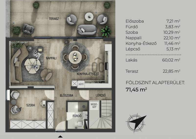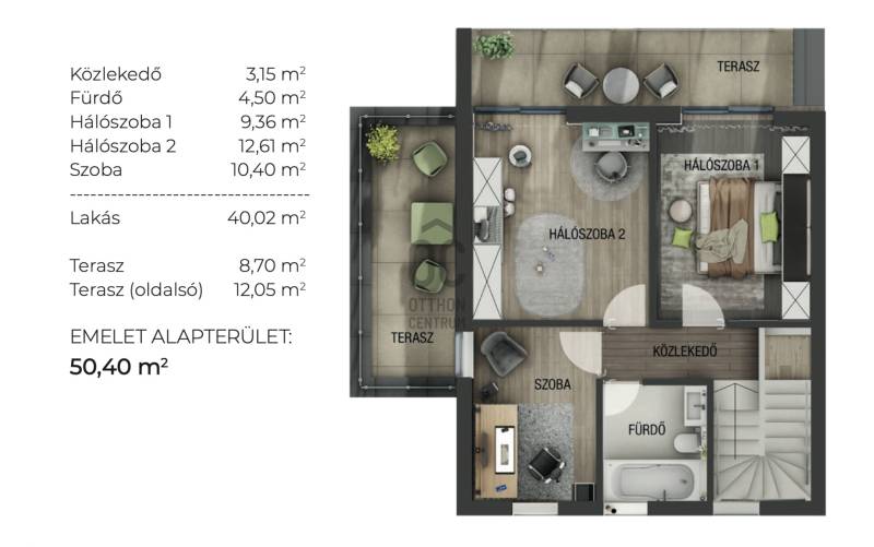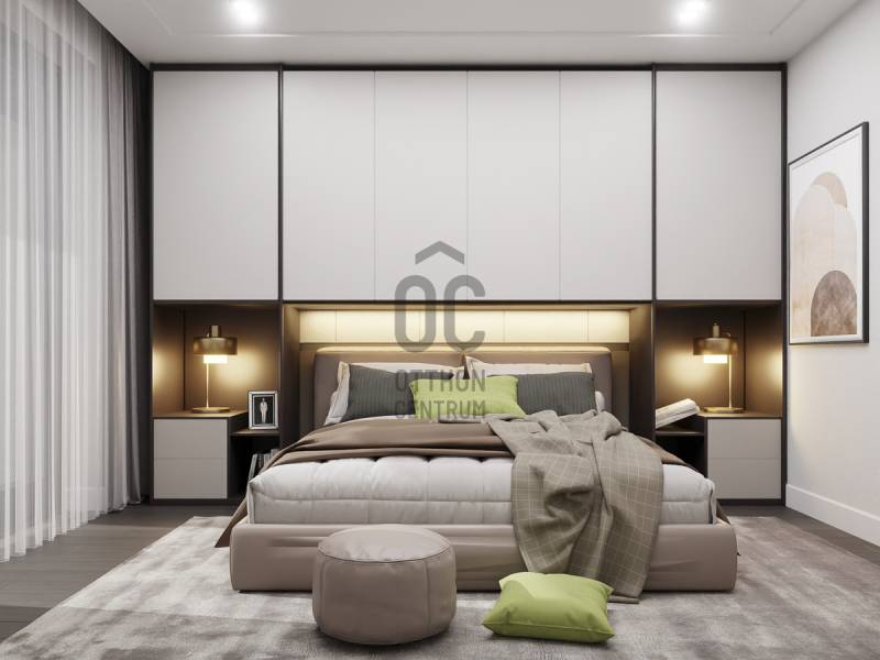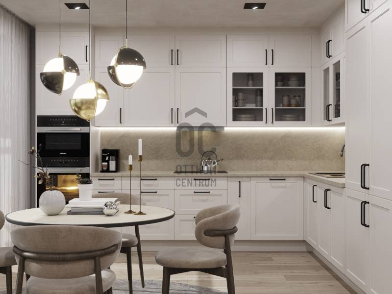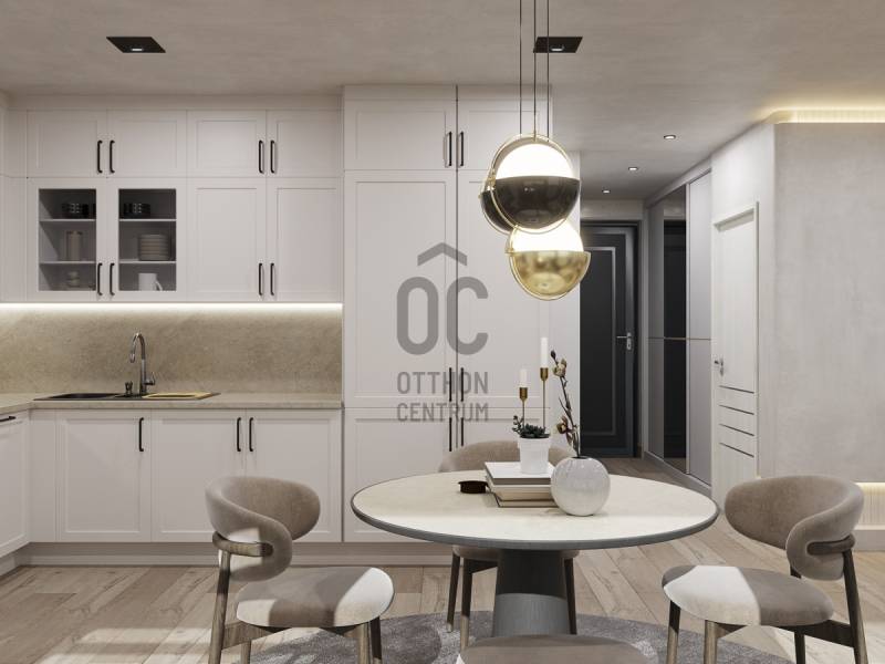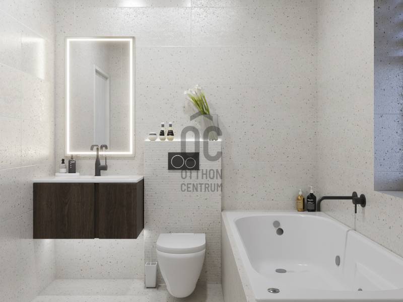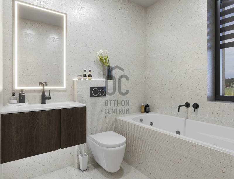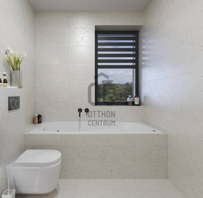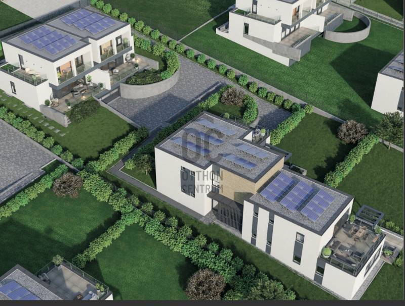 Aranyhegy egyik legszebb részén, a csendes Almáskert utcában kínálunk eladásra egy vadonatúj, panorámás, luxus színvonalú ikerházat.Az ingatlan 121,85 m²-es, két szinten elosztva, összesen 5 szobával és három terasszal rendelkezik. A tágas és világos tereket a délnyugati tájolás és a Hármashatár-hegyre nyíló kilátás teszi igazán különlegessé.Főbb jellemzők:Alapterület: 100 m² ( bruttó 121,85 m² ) (Földszint: 71,45 m² + Emelet: 50,40 m²)Helyiségek száma: 5 szoba, 2 fürdőszoba, amerikai konyhás nappali, előszobaTeraszok: 3 db (összesen több mint 40 m²)Kert: 300 m2Kilátás: Panorámás, zöldövezetiKomfort fokozat: LuxusFűtés: Modern levegő-víz hőszivattyús rendszer padlófűtéssel és fan-coil hűtésselFontosabb műszaki adatok:Szerkezet: Porotherm X-therm falazat, monolit vasbeton födémek, 15 cm hőszigetelésTető: Lapos tető, modern víz- és hőszigeteléssel (Bauder rendszer)Nyílászárók: Háromrétegű, hőszigetelt műanyag ablakok (Ug=0,5 W/m²K), motoros alumínium redőnyökBurkolatok: Prémium greslapok, laminált parketta vagy vinyl padlóFürdők: Magas minőségű szaniterek, vízzáró szigetelésKert: Parkosított kert, térkövezett autóbeállóEnergiahatékonyság: Hőszivattyús fűtés, napelem előkészítésAz ikerházhoz 2 db teremgarázs hely tartozik, amelyek külön megvásárolhatók, darabonként 10 millió Ft-ért. Az ingatlanhoz ajándék tároló (12,6 m²) és 1 db gépkocsi-beálló is jár.Ez az otthon ideális választás mindazoknak, akik értékelik a csendes, zöld környezetet, ugyanakkor fontos számukra a modern, energiatakarékos műszaki tartalom és a magas minőség.Egyéb:A ház körül teljes szivárgó („drén”) rendszer kerül kiépítésre.A csapadékvíz tárolására szolgáló zárt tartály kerül beépítésre.Opció: locsoló rendszerrel történő integrációval.vételár nem tartalmazza:- beépített szekrények, konyhabútor és azok beszerelési költségét- világító testek, lámpák és azok beszerelési költségét- beépített háztartási gépeketA környék ideális a pihenésre, feltöltődésre. A zöld, frisslevegős, madárcsicsergős környezetnek köszönhetően magas minőségű életmódot élhetünk. Pár perc sétatávolságra található vonat és buszmegálló.Egyedi igényekre szabott lakáshitelekkel állunk rendelkezésére. Bankfüggetlen hitelcentrumunk az országban elérhető összes bank és hitelintézet ajánlatát versenyezteti az Ön számára díjmentesen. Munkatársaink nagy szakmai tapasztalattal várják Önt az előre egyeztetett időpontban akár a normál munkaidő után is.Bővebb információért és a megtekintéssel kapcsolatban hívjon bizalommal!