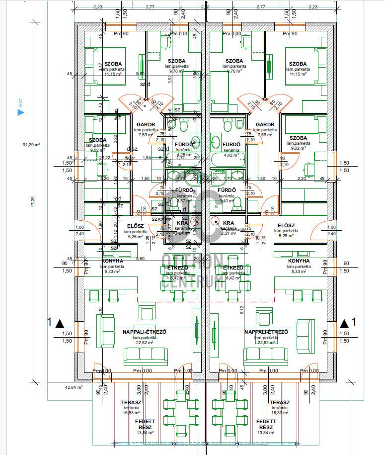 Projekt bemutatásaA tervezés során nagy figyelmet kapott, hogy ne egymás mögé épüljenek meg az ingatlanok, hanem egymás mellé, tehát utcáról megközelíthető mindkettő.A két lakás saját, kerítéssel elkerített, 450 m2 , rendezett udvarral rendelkezik.Az ingatlan hasznos alapterülete : 90 m2Helyiségei : konyha - étkező - nappali, 3 szoba, fürdőszoba káddal - wc - vel - bidevel, fürdőszoba zuhanyzóval - wc - vel, közlekedő, gépészeti helyiség / spájz, fedett terasz, nyitott terasz, önálló garázs.Déli tájolású, napfényes, világos lakás, amelynek ablakai elektromos redőnnyel, illetve a nappali - terasz üvegfelületei motoros zsaluziával szerelve gondoskodnak az árnyékolásról.Az ingatlan kialakítása : terasz, kertkapcsolattal rendelkező konyha - étkező - nappali, valamint az elkülönített, intim hálóblokk 2 fürdővel, 3 szobával, az előszobában, és a közlekedőben beépített szekrények elhelyezésére kialakított terület.A kert felé elhelyezkedő nappalihoz fedett terasz tartozik, fedése átlátszó tetejű, eloxált alumínium szerkezetű, elhúzhatós, hangulatos árnyékolással.A garázs tágas, a szokásosnál hosszabb, burkolt, illetve az utcafronton + autók parkolására kialakított terület található, térkővel burkolva.Műszaki jellemzők :- 38 - as porotherm falazat- 15 cm homlokzati szigetelés- 3 rtg műanyag nyílászárók- tömör anyagú belső ajtók- hőszivattyús padlófűtés + melegvíztermelés puffer tartállyal- nappaliban, szobákban hűtő - fűtő klíma- motoros redőny- motoros szekcionált garázskapu- vízálló, fózolt laminált padló- spanyol csempe, járólap- 3 D rácsos kerítés - rendezett terepAz ingatlan teljesen készen van, akár azonnal költözhető !!Alkalmas fiataloknak, 1 - 2 gyermekes családnak, az utópálya közelsége miatt, azoknak, akik sokat utaznak.Csendes környezet , jó szomszédok jellemzik a lokációt.Ha felkeltettem az érdeklődését, kérem, hívjon bizalommal !