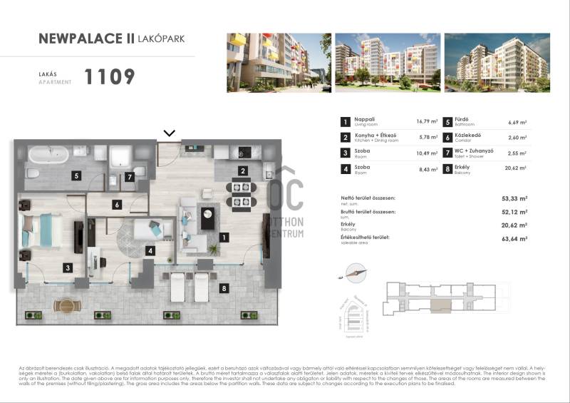 Projekt bemutatásaNew Palace II. ütemA New Palace a XIII. kerület csendes részén épül. A megújult kertvárosias környezet a pesti oldal egyik legkedveltebb részei közé tartozik, az itt élők egyszerre élvezhetik a csöndes kis utcák nyugalmát és a belváros közelségét.A társasház különleges, extravagáns homlokzatával egyedi fiatalos dizájnjával, kiemelkedik a környező épületek közül és ezáltal lesz majd sokáig a környék ismert és meghatározó tájékozódási pontja. A már eddig is komoly fejlődésen és megújuláson átesett városrész a projekt megvalósulásával beírja magát a kerület új városrészei közé.A földszint + 12 emelet magas épületet elegáns, kertépítők által tervezet parkok veszik körül, megreformálva a társasház környezetét is. A zárt, csak a társasház lakói által megközelíthető udvaron fákkal, cserjékkel tarkított, füvesített zöldkert kerül kialakításra.A lakások két elegáns, egymástól elkülönülő lobbyn keresztül közelíthetőek meg, lépcsőházanként két-két lifttel. A lakáskínálatban az egyszobás lakástól egészen a négyszobásig mindenféle elosztású megoldás megtalálható, a kínálatban alig van két egyforma lakás. Minden lakás rendelkezik erkéllyel vagy terasszal, a földszinti és néhány exkluzív emeleti lakás pedig, intenzív zöldtetővel, saját kertrésszel.Figyelembe véve a jövő elvárásait, a társasház modern, környezetbarát, mennyezeti hűtő, -fűtő rendszerrel ellátott.Vevőinknek lehetőségük nyílik arra is, hogy megvásárolt otthonukat az utolsó részletig személyre szabhassák: módosítással élhetnek otthonuk elosztása tekintetében is, továbbá széles kollekcióból választhatnak meleg- és hideg burkolatokat. Az alapáras burkolatokon felül, elérhetőek feláras termékek is, mely biztosítja, hogy személyiségük otthonukban is vissza tükröződhessen.Az infrastruktúra is magáért beszél: a közeli Váci út kiváló közlekedése és bevásárlási lehetőségei, a megújult 3-as metró Gyöngyösi utcai megállója rövid sétával elérhető, hasonlóan az idilli hangulatú Gyöngyösi sétányhoz, mely a kerület egyik legkedveltebb részei közé tartozik. Szintén pár perc sétatávolságra a folyamatosan megújuló és minden igényt kielégítő Duna Pláza bevásárlóközpont (benne: SPAR, gyógyszertár, Rossmann, DM, Médiamarkt, tisztító, fodrászatok, virágbolt, Libri könyvesbolt, papír-írószerbolt és számos ruházati bolt. Kényelmesen megoldható a napi fogyasztási cikkek beszerzése is a nap bármely órájában a közvetlen közelben lévő Tesco áruházban és az üzletsoron lévő boltokban. A lakópark tágabb vonzáskörzetében de még mindig elérhető távolságban találjuk Újpest-központot, a Népszigetet és az Újpest vasútállomást.Irodánkban a legtöbb XIII. kerületi beruházás lakásai elérhetőek ügyfeleink számára.A jelen adatok tájékoztató jellegűek, ezért a Beruházó (sem a hirdető) azok változásával, vagy bármely attól való eltéréssel kapcsolatban semmilyen kötelezettséget, vagy felelősséget nem vállal.Az alaprajzokon ábrázolt berendezési tárgyak és bútorok, a burkolatok megjelenése nem képezi a szerződés tárgyát. A pontos felszereltségről a műszaki leírásban olvashat bővebben.Az aktuális lakáskínálatról és árakról érdeklődjön telefonon!
