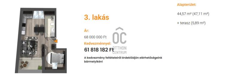 Csak kp - s vevőnek eladó , a vételár ezzel a feltétellel értendő !!Ez az ingatlan az 1. emeleten helyezkedik el, tetőri kialakítású,.Beépített alapterület : 47,11 m2 + 5,89 m2 terasz, 1,90 feletti, hasznos alapterülete : 44,57 m2 .Konyha - étkező - nappali + szoba kialakítású.Projekt bemutatásaDebrecen belvárosában, 621 m2 - es telken 4 lakásos társasház + 1 db rendelő épül. Várható átadása : 2027 tavasza.Belvárosi környezetben ideális választás saját otthonnak, illetve befektetési célból is.Parkolás : az udvarban 5 db felszini parkoló kerül kialakításra.Műszaki jellemzői :- A + energetikai besorolású- protherm 30 NF tégla falazat- 15 cm homlokzati szigetelés- 3 rtg műanyag nyílászárók- hőszivattyús fűtés ( levegő - víz )- padlófűtés- 1 db 3,5 kw - os klíma lakásonként- kereteken belül választható belső műszaki tartalom- Stb ....A beruházó, illetve kivitelező cég, megbízható, rengeteg referenciával rendelkezik.Ha felkeltettem az érdeklődését, kérem hívjon bizalommal.