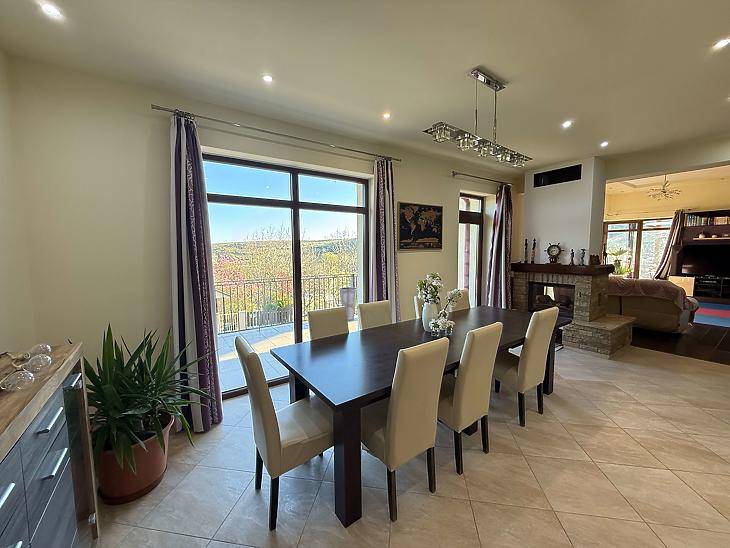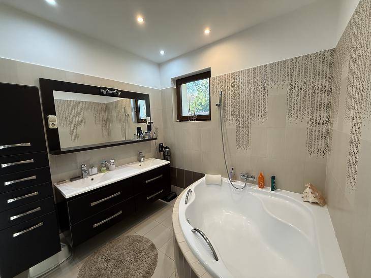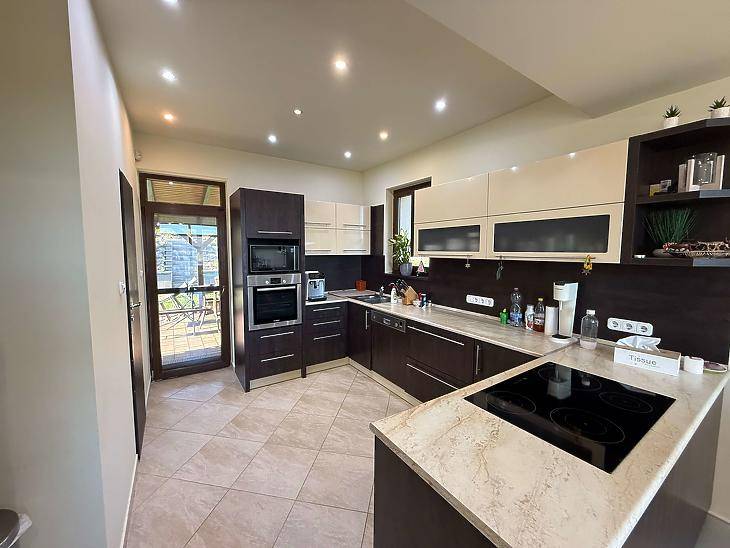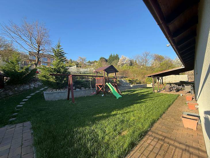 Pilisszentkereszten eladó egy panorámás családi ház – gyönyörű kilátással a pilisi hegyekre1500 nm-es, parkosított telken kínálunk megvételre egy 2010-ben épült, kiváló állapotú családi házat, csendes, zöld környezetben.A 222,74 nm-es lakóterületet egy 30 nm-es panorámás terasz egészíti ki, ahonnan gyönyörű kilátás nyílik a Pilisi hegyekre. Az ingatlanhoz egy 34,08 nm-es garázs tartozik, elektromos garázsajtóval.Műszaki jellemzők:• 30-as Porotherm tégla falazat, 15 cm szigeteléssel • Monolit vasbeton födém, 15 cm kőzetgyapot hőszigeteléssel • Cserépfedésű tető • Kondenzációs gázkazán + padlófűtés és radiátor• Kandalló a hangulatos fűtésért • Réz villanyvezetékek és fűtéscsövezés • Fa nyílászárók, szúnyoghálóval Telek és extrák:• Parkosított kert • Fúrt kút öntözéshez • 10 nm-es kerti faház • Elektromos kapu + kovácsoltvas kapu • Riasztórendszer Elhelyezkedés:• Buszmegálló kb. 9 perc sétára • Kisbolt kb. 12 perc sétára Ideális választás azoknak, akik nyugodt, természetközeli környezetben keresnek otthont, ugyanakkor fontos számukra a jó megközelíthetőség és a minőségi műszaki tartalom.